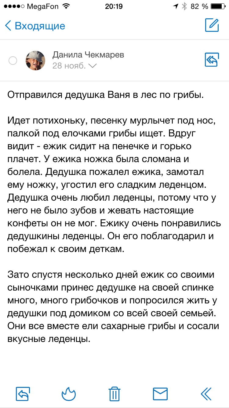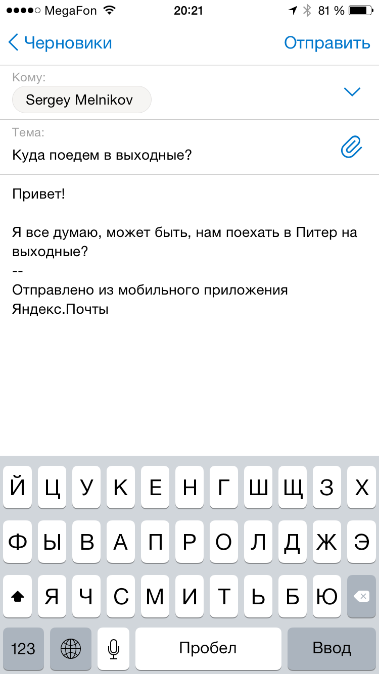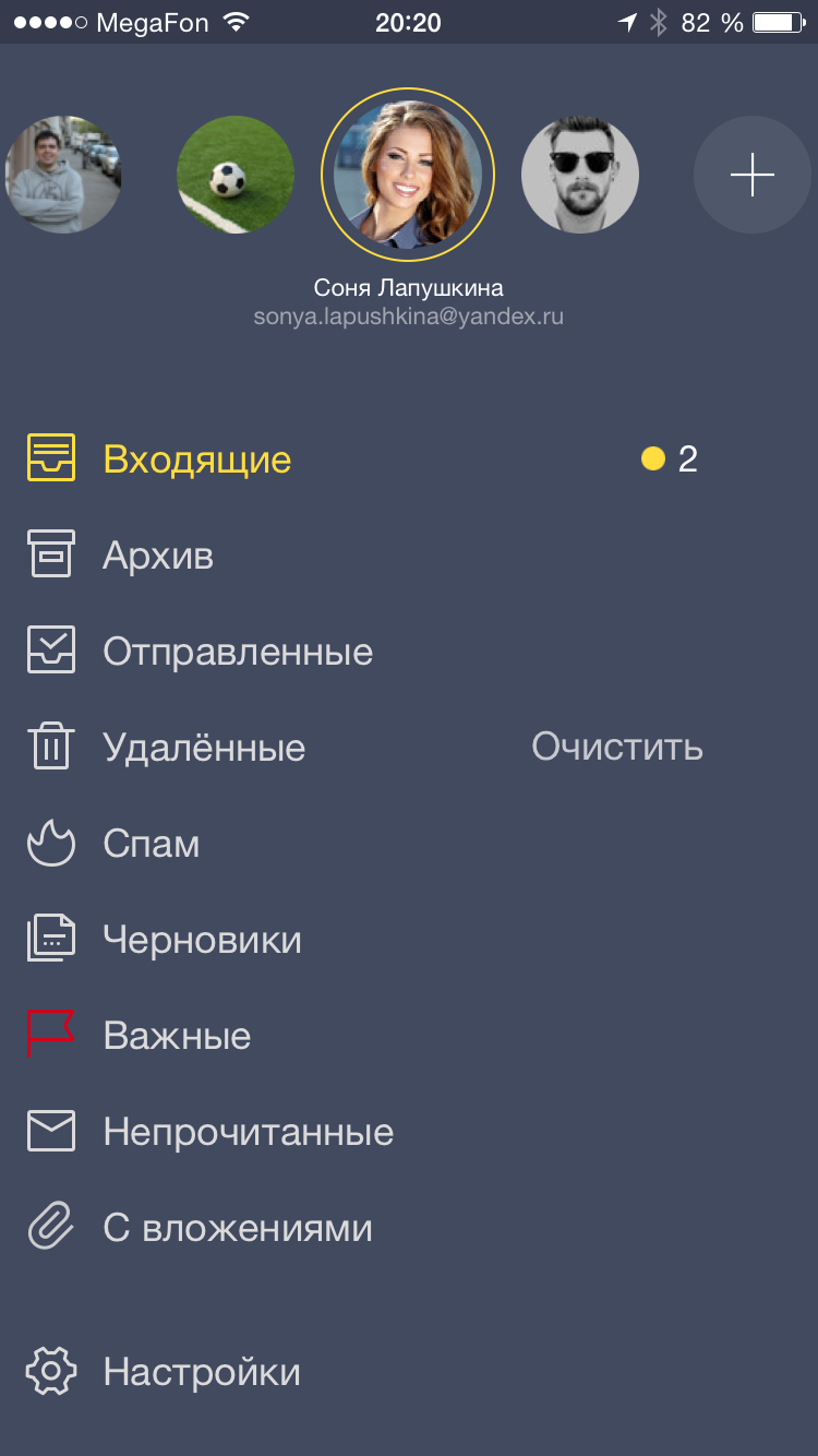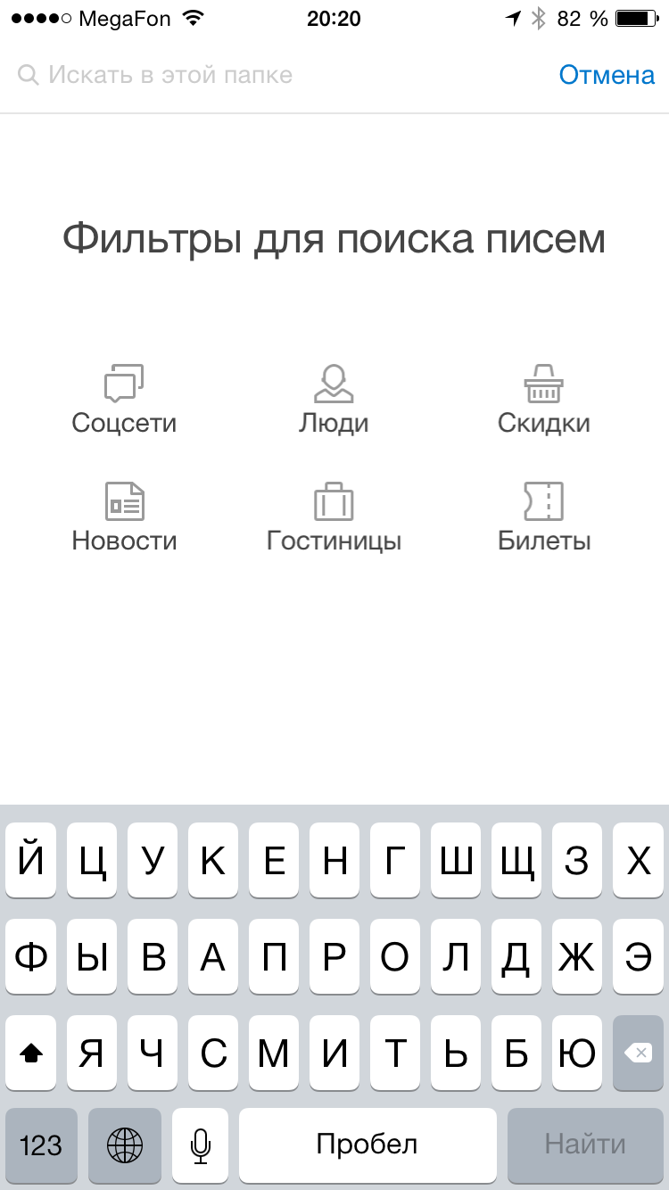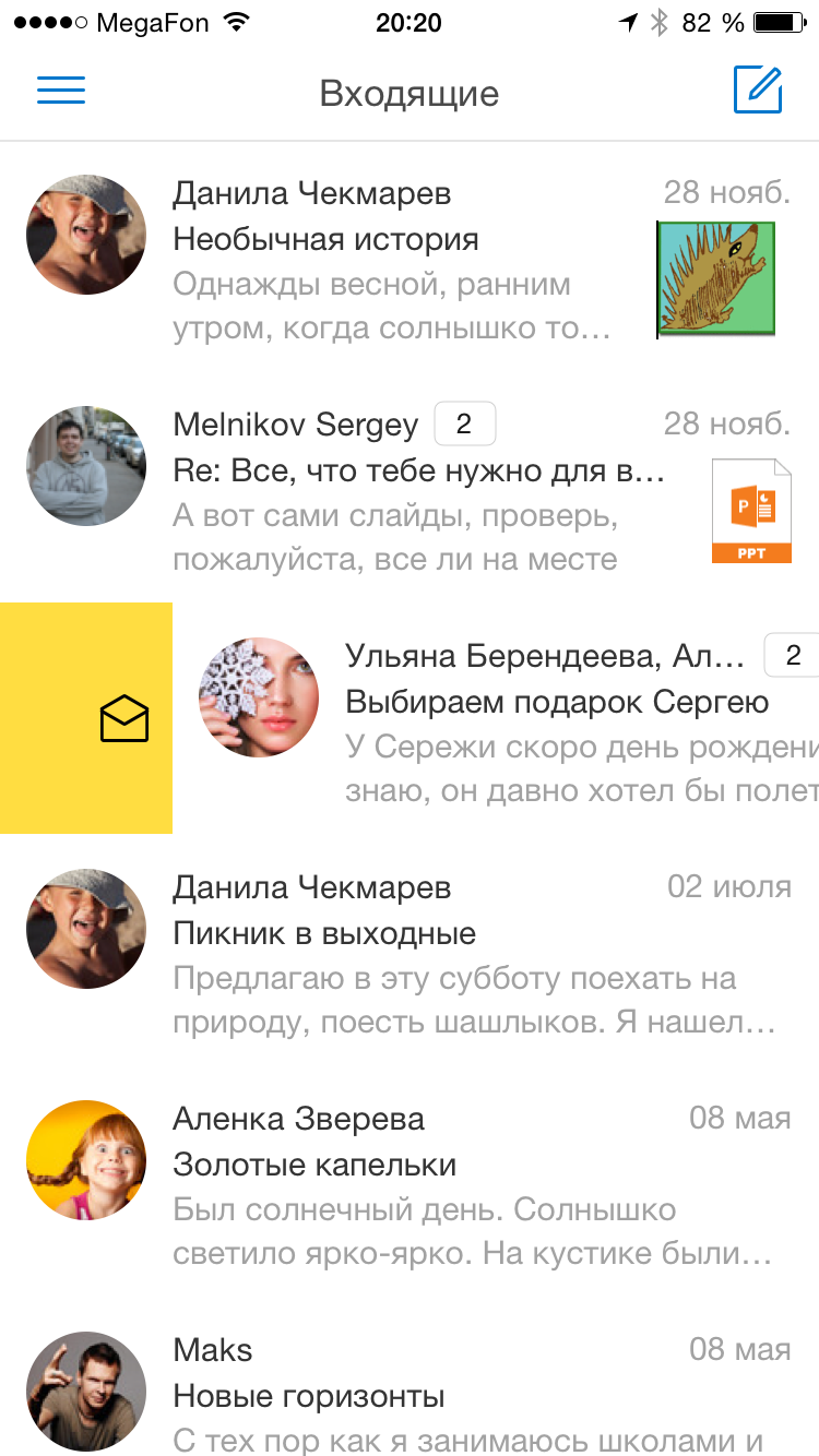 Главное в любой почте — это письма. Поэтому в новой Яндекс.Почте им отводится максимум пространства на экране. Все необходимые инструменты — настройки, список папок и поиск — остаются под рукой: на расстоянии одного движения пальцем. Чтобы удалить ненужные письма или пометить нужные как прочитанные, достаточно провести пальцем по заголовку — так что разобрать почту теперь можно очень быстро. Понять, что находится во вложении — картинка, документ или таблица, — можно по картинке-превью. Открывать письмо для этого необязательно.