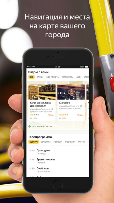 Нужное не придётся долго искать — вся информация собрана на главном экране. Содержимое экрана подстраивается под обстоятельства. Так, в обед Яндекс посоветует места с бизнес-ланчами, вечером — бары и пабы, ночью — организации, которые работают круглосуточно. Прогноз погоды и данные о транспорте отображаются для того места, где сейчас находится человек.