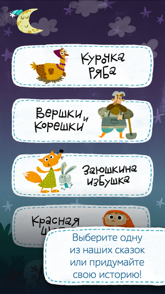 Но вернемся к приложению. Сначала полагается выбрать историю. Приятно, что создатели позаботились предложить нам сразу несколько вариантов для детишек разного возраста. Тут и вам и Ряба, и Красная Шапочка, и вездесущий Зайка, неосмотрительно пригласивший Лису в свою избушку. Есть и «Та самая сказка» — для тех, кто хочет рассказать сказку, которой нет в приложении.