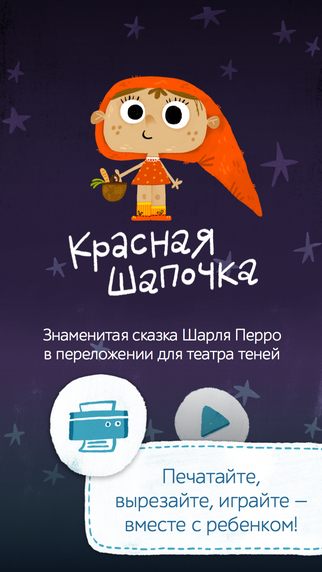 Но вернемся к сказкам. Нажимаем на ту, что милее сердцу, и попадаем на следующий экран. Все самое важное — внизу. Нажимаем на левую кнопку, чтобы обзавестись героями. Поскольку AirPrint у нас не слишком популярен, то выкройку с персонажами скорее всего придется отправить себе на почту, а напечатать уже с компьютера.