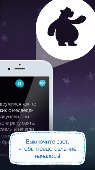 Пришло время правой кнопки. Нажали и, главное, не зевать. Текст автоматически поползет снизу. Не очень быстро, но неотвратимо. Хотя при желании его можно прокрутить вперед или назад. И даже назазд-назад, что очень полезно, если по ходу истории на сцену решили вылезти все герои сразу, а вы проворонили кульминацию. Если дело совсем швах — наверху есть кнопка паузы. У каждой сказки своя мелодия, но если не нравится, ее всегда можно отключить — кнопкой в правом верхнем углу.