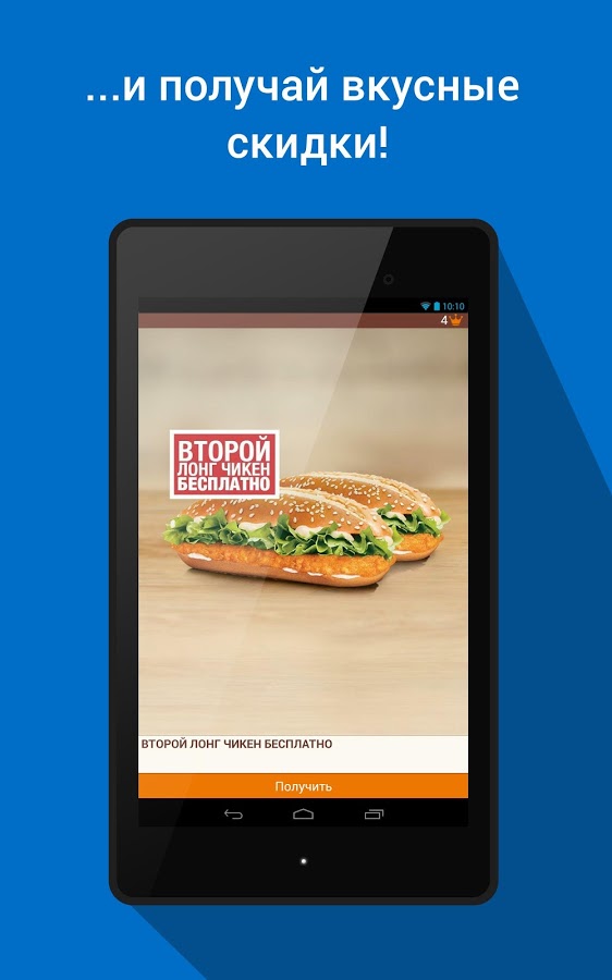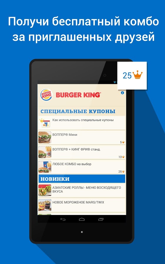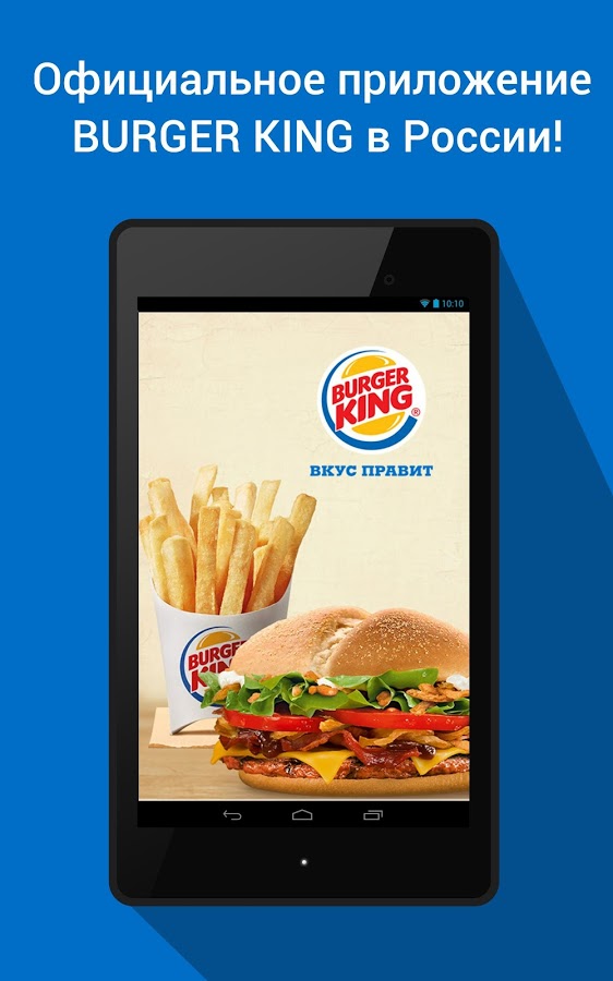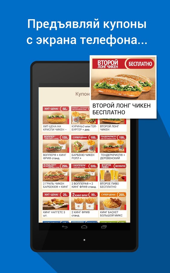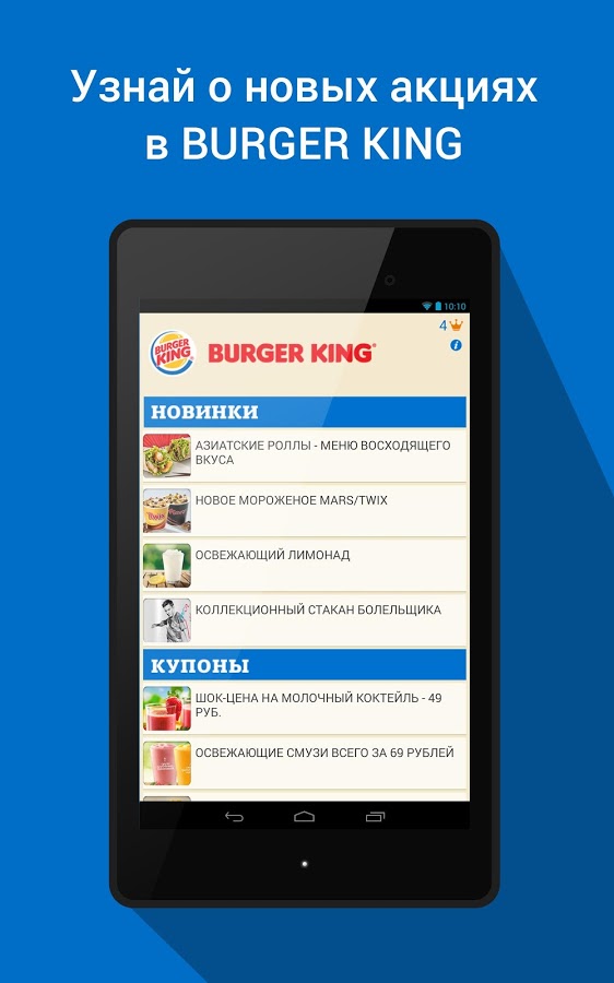 Официальное приложение сети BURGER KING было создано для всех любителей бургеров в России. Оно доступно для скачивания сразу на трех платформах — в AppStore, Google Play и Windows Phone Store. С его помощью можно предъявлять с экрана телефона купоны, которые ранее были доступны клиентам только в бумажном виде. Среди других «плюшек» — секретный и королевские купоны, которые можно получить только в приложении.