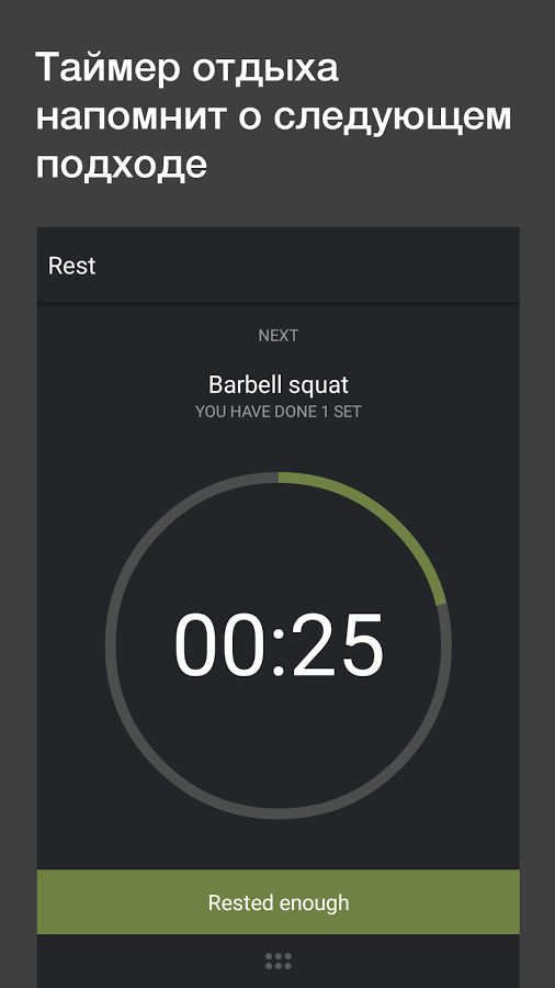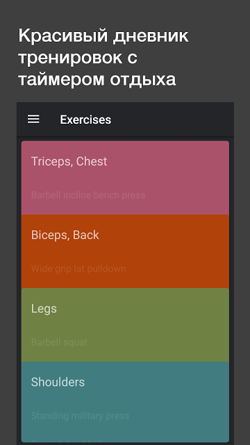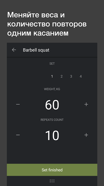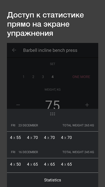 - Понятная статистика прогресса по каждому упражнению, которую можно смотреть по весам, количеству повторений и времени отдыха;