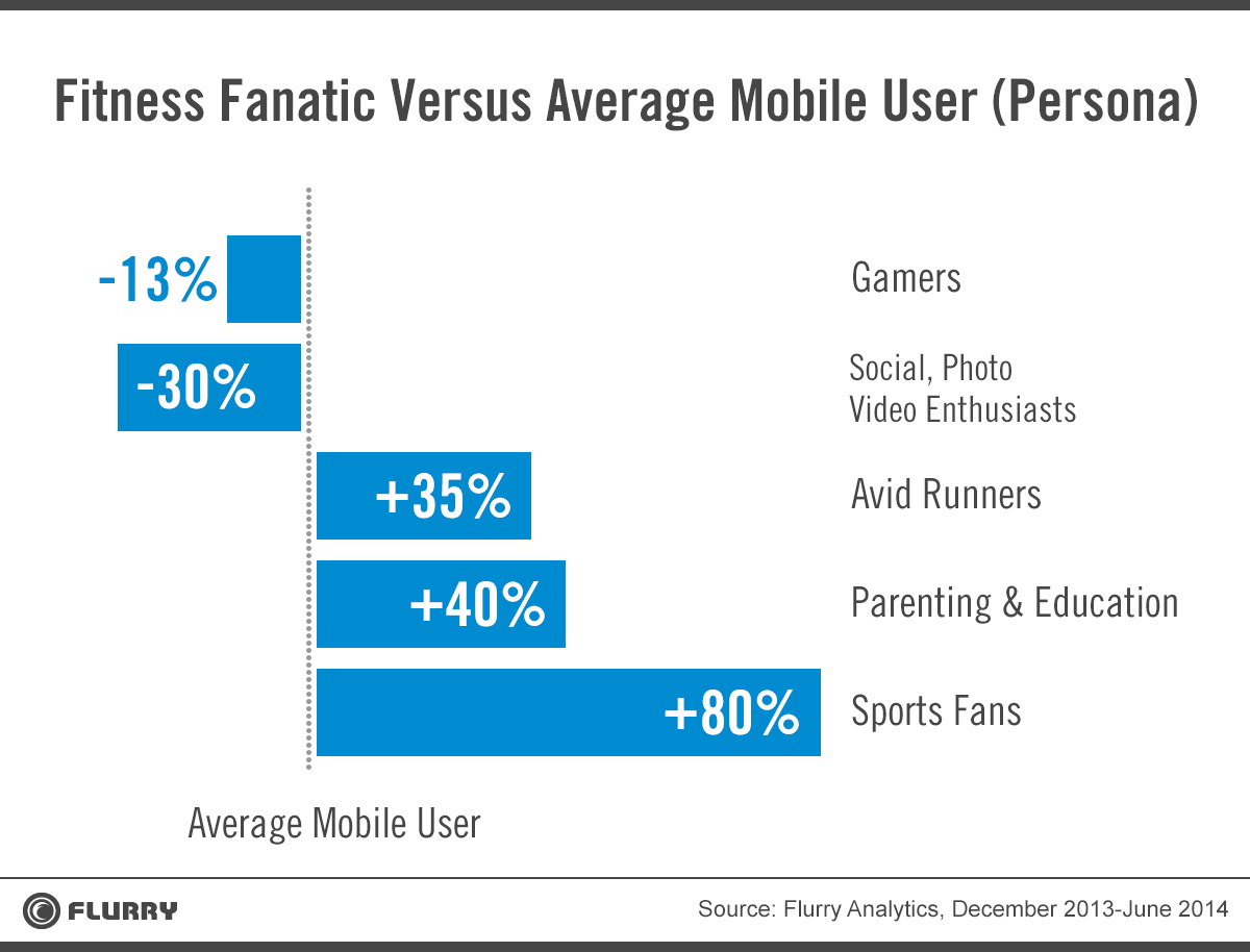 Но главное, отмечает Flurry, в так называемых «фитнес фанатиках», тех, кто использует приложения для здоровья и фитнеса в три раза больше среднего. Это больше женщины, возраста от 25 до 54 лет, фанаты спорта, родители, сравнительно мало играющие в игры и сидящие в социальных сетях. Они и есть те, кто обеспечивает такой рост приложений из этой категории.