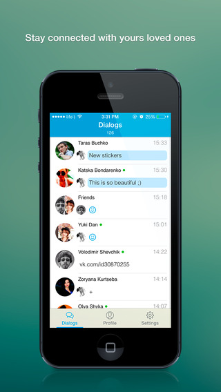 Приложение выгодно отличается от конкурентов приятным динамичным дизайном с плавающим меню, неназойливыми звуками, необычными стикерами, которые хочется использовать. Есть возможность отправлять сообщения со скрытым онлайн статусом, прислать фото и геопозицию, просматривать свой профиль, фото, список друзей с отображением онлайн-статуса и последней активности.