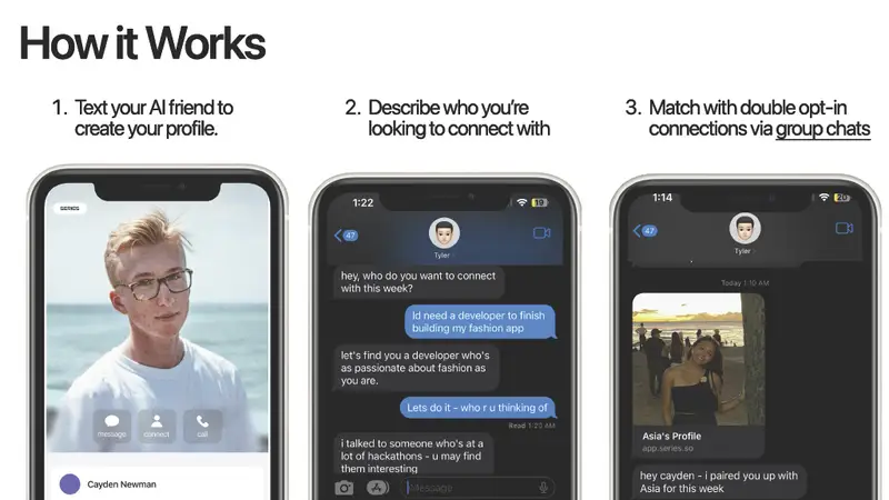 Пользователи отправляют SMS-сообщение на номер телефона (Series AI) в iMessage, объясняя, кто они и с кем хотят связаться. После этого Series AI отправляет пользователю ответное сообщение, предлагая так называемые «репосты» — карусель из 10 изображений, которые можно легко пролистывать, — постов других пользователей Series AI, которые также хотят связаться с кем-то по аналогичной причине. Каждая карточка карусели содержит фотографию пользователя и его запрос, и пользователи могут нажать и удерживать фотографию в карусели, чтобы начать приватный разговор с другим пользователем в чате Series AI, не сообщая свой личный номер.