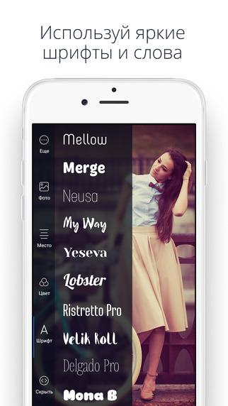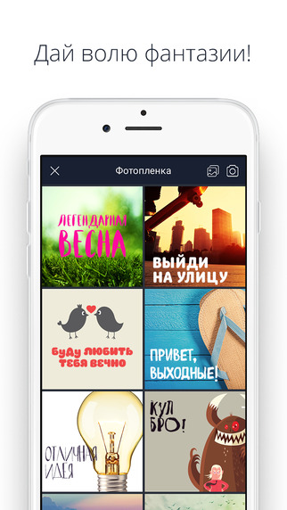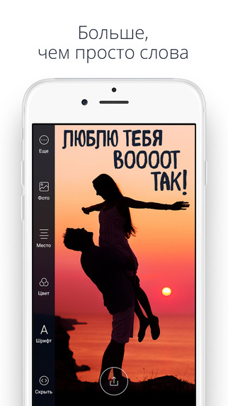 Разработчики специально подобрали уникальные шрифты и цвета, чтобы вы смогли воплотить свои лучшие идеи и создать уникальные изображения для любого случая и настроения. Редактируйте, сохраняйте и отправляйте своим друзьям всего в несколько движений!