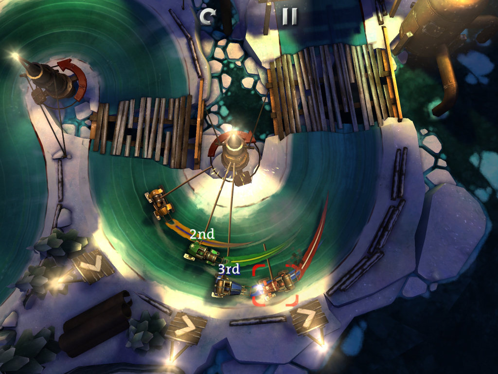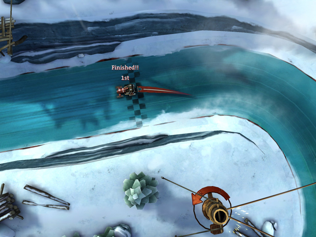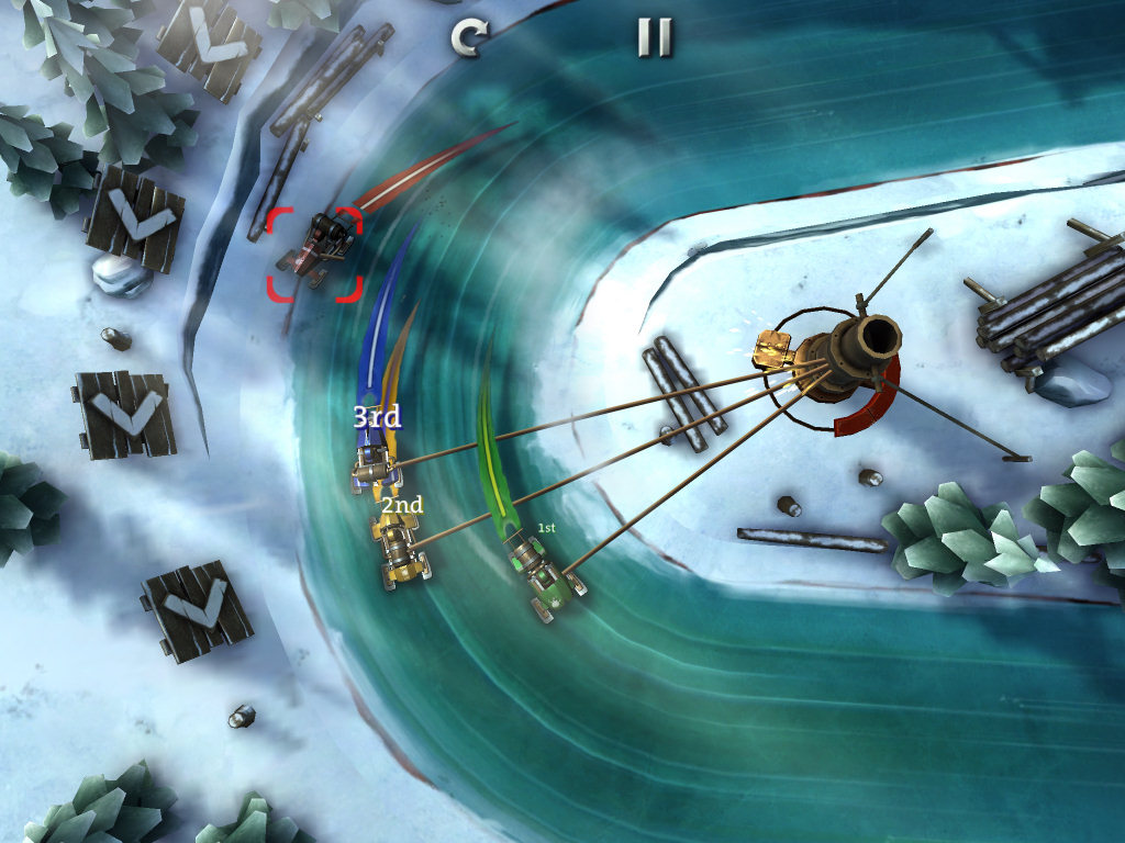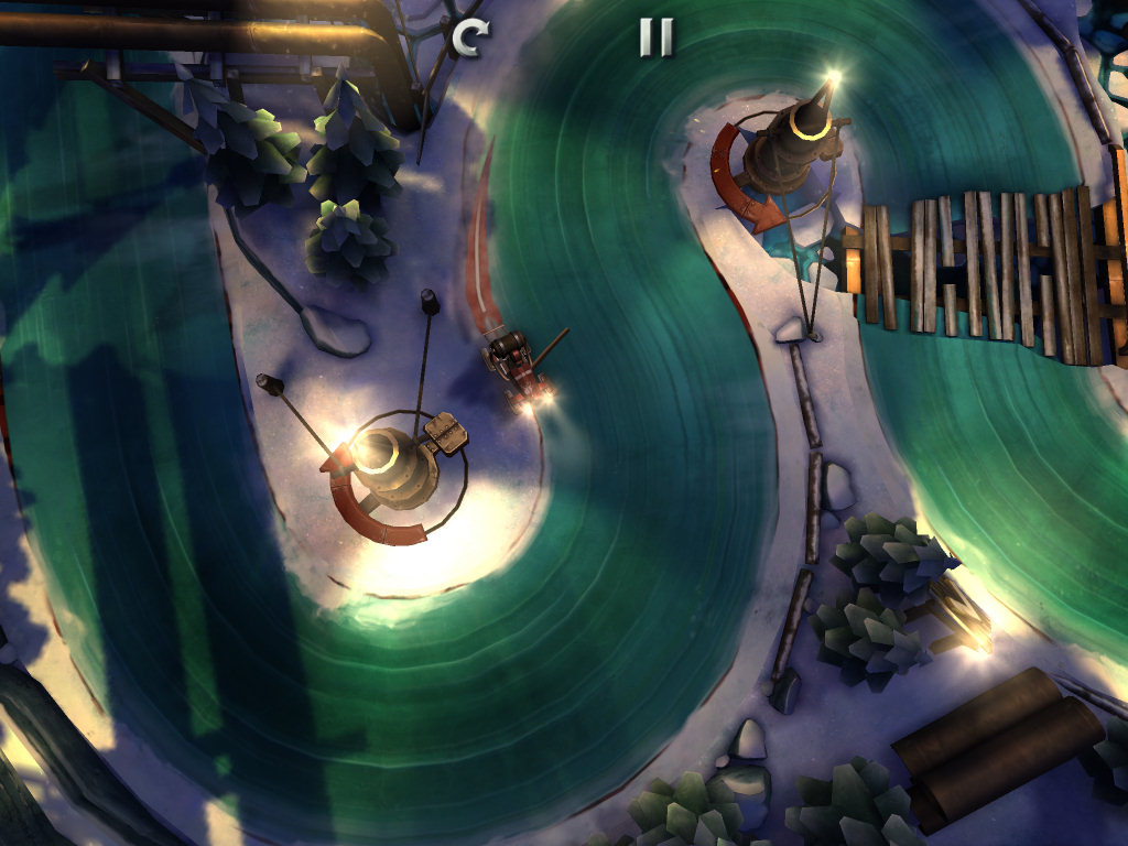 Игровая вселенная Slingshot Racing отрисована в стиле стимпанка, а разъезжать нам предстоит на забавных санях, для которых разработчики создали симпатичные ледовые трассы. Самое же интересное в игре – это революционное управление, которое не предусматривает торможение, а проходить повороты нужно с помощью «подручного оборудования» – стоящих поблизости башенок, за которые надо зацепиться специальным гарпуном. Будьте осторожны: как только понимаешь механизм прохождения трассы, игрушка настолько затягивает, что оторваться от нее очень сложно.