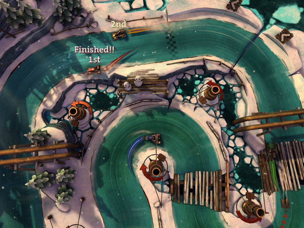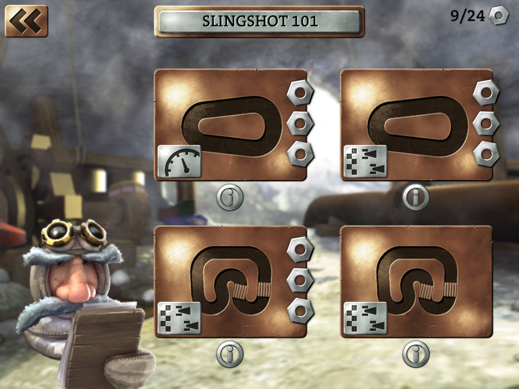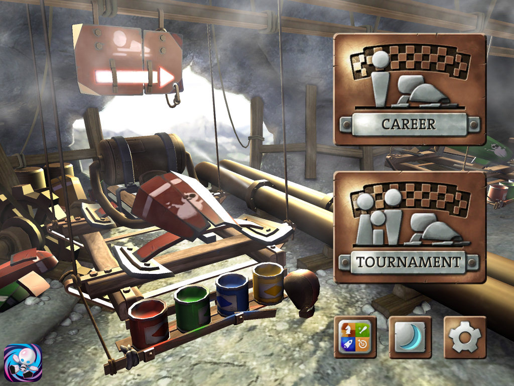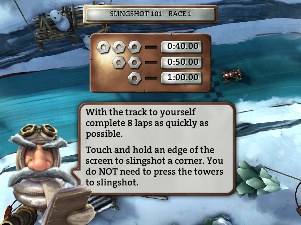 Игровая вселенная Slingshot Racing отрисована в стиле стимпанка, а разъезжать нам предстоит на забавных санях, для которых разработчики создали симпатичные ледовые трассы. Самое же интересное в игре – это революционное управление, которое не предусматривает торможение, а проходить повороты нужно с помощью «подручного оборудования» – стоящих поблизости башенок, за которые надо зацепиться специальным гарпуном. Будьте осторожны: как только понимаешь механизм прохождения трассы, игрушка настолько затягивает, что оторваться от нее очень сложно.