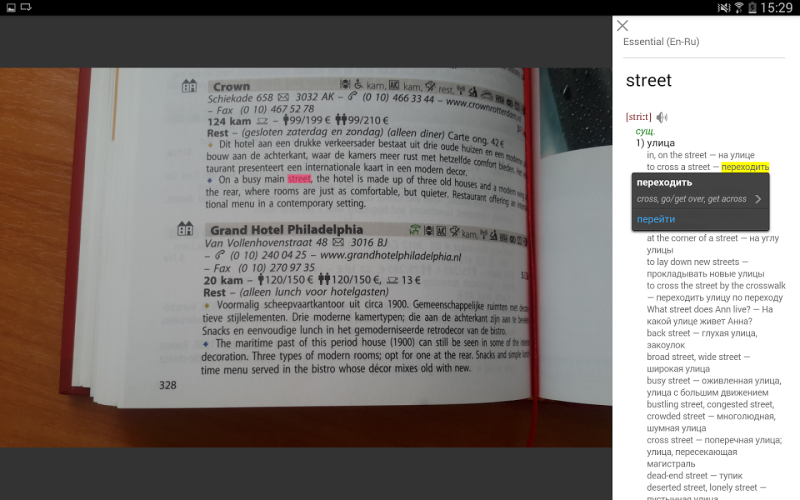 Live-перевод раскроет смысл коротких текстов – достаточно перевести камеру смартфона или планшета в видео-режим, совместить указатель-прицел с любым незнакомым словом и коснуться пальцем экрана. Если текст большой, лучше воспользоваться фотопереводом: сфотографировать лист целиком и перемещаться по экрану, нажимая на каждое непонятное слово.