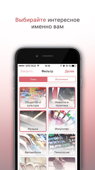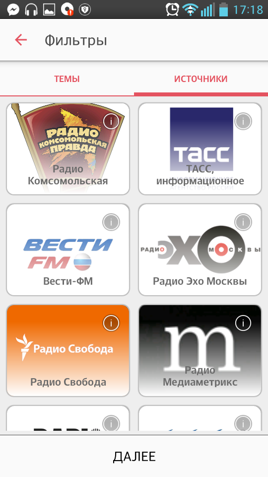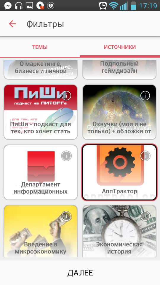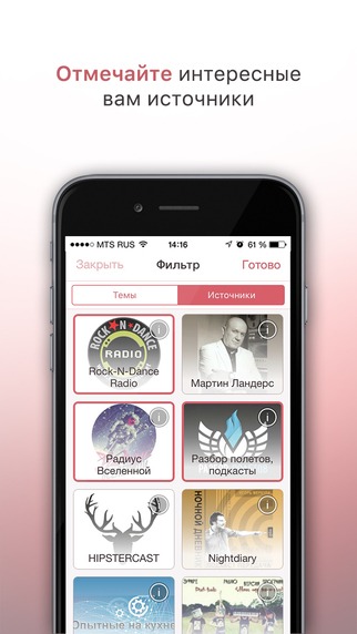 Далее определиться с источниками, которые могут рассказывать об этих направлениях. Интересно, что эти источники не целиком перетекают в вашу ленту, а там появляются только записи именно по нужным темам. Всего источников в SoundStream около 270 — кстати, там есть и AppTractor, или, например, любимый нами «Аэростат».