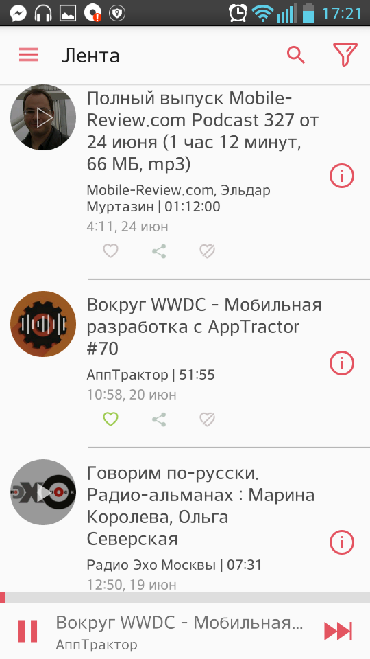 Из плеера же – поделиться с друзьями информацией о записи через стандартный диалог шаринга, отложить для дальнейшего прослушивания, добавить в избранное, посмотреть информацию выпуска.