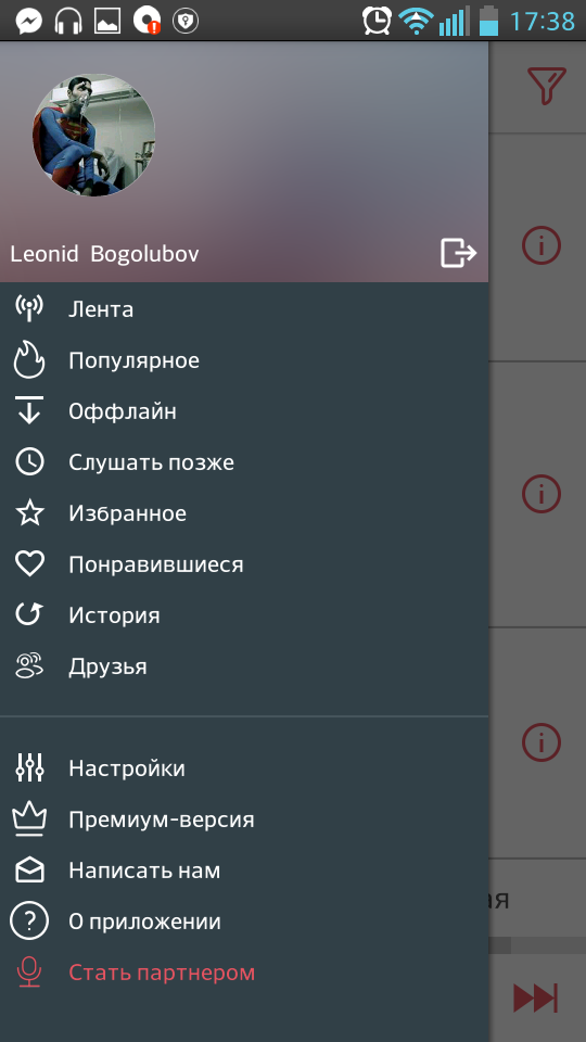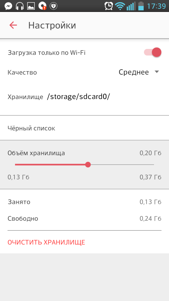 Все настройки и функции дополнительно продублированы в меню. Там ваши любимые записи, список оффлайн-прослушивания и все остальное. Там же вы можете настроить использование приложения – разрешить загрузку только при подключении к Wi-Fi сети и задать параметры хранилища записей.