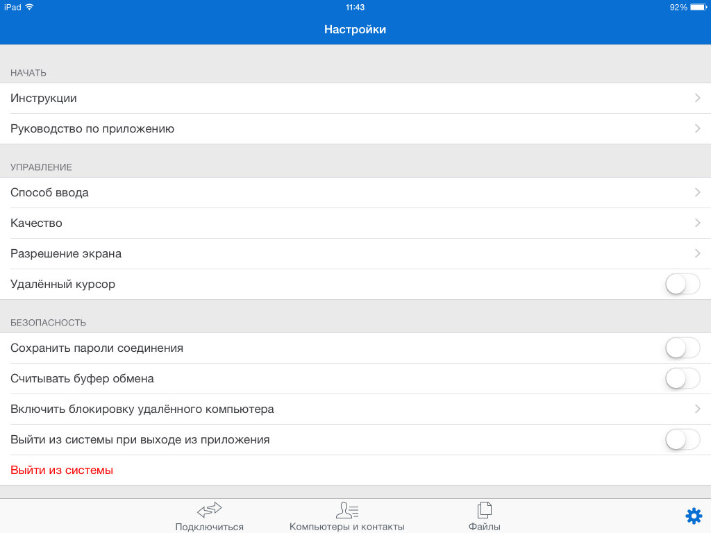 Приложение гарантирует безопасное соединение с использованием 256-битного шифрования сеанса AES и обмена ключами RSA (2048 бит), вместе с тем не вызывая лишних вопросов у встроенного брэндмауэра и антивирусных утилит. Пользователю доступны все функции клавиатуры удаленного устройства, включая служебные клавиши, а кроме того, управление курсором в стандартном режиме «мышь» или переключение на виртуальный тачпад.