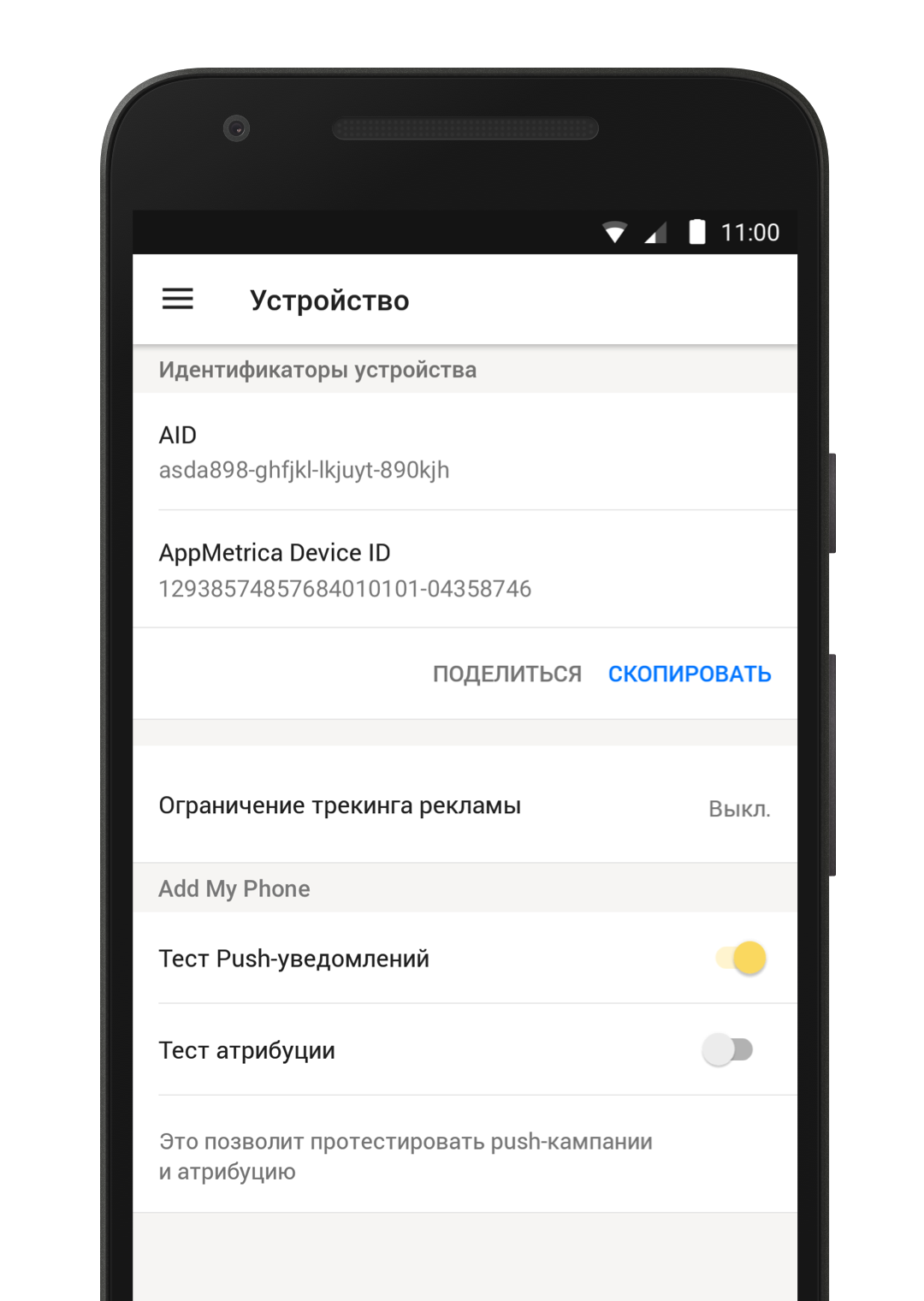 - Управление тестовыми устройствами. Теперь не нужно искать идентификатор в настройках устройства и переписывать его. Достаточно установить один из переключателей в приложении, и устройство добавится в тестовые автоматически. Здесь же можно посмотреть идентификаторы и поделиться ими. Например, отправить их нашей службе поддержки.