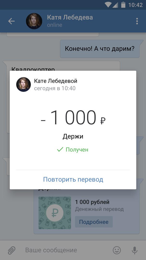 Сегодня ВКонтакте стала доступна услуга безналичных денежных переводов. Деньги можно отправлять в сообщениях, используя банковскую карту. Номер карты получателя не нужен — он сам решит, куда зачислить переведённые средства. Сервис работает в диалогах на сайте и в официальных мобильных приложениях для Android и Windows Phone. Владельцам iPhone отправка переводов станет доступна вместе с ближайшим обновлением приложения, а получение переводов доступно уже сейчас.