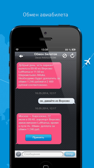 После того, как запрос создан, пользователь переходит в чат, где общается с оператором службы поддержки. Оператор предлагает условия возврата или обмена, пользователь соглашается и успешно оформляет обмен или возврат авиабилета.
