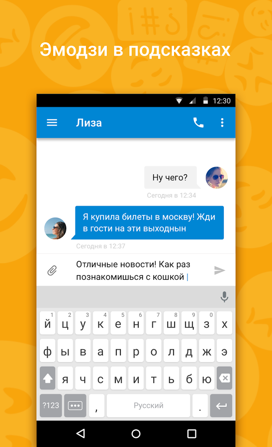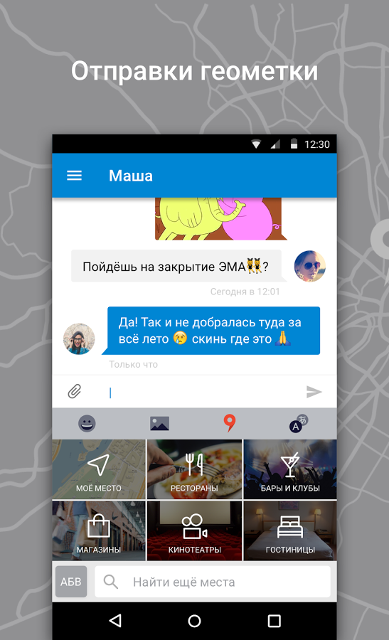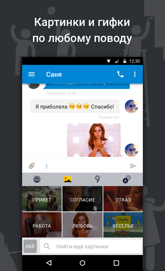 Переписка в чатах — это обмен не только фразами, но и картинками. В Клавиатуре есть поиск по изображениям — с его помощью легко найти и переслать собеседнику гифку или демотиватор. Добавить репликам наглядности позволяют эмодзи — Клавиатура подбирает подходящие и показывает их в подсказках. Помимо картинок и эмодзи, искать можно места — например, ближайшие кафе, бары, магазины или кинотеатры.