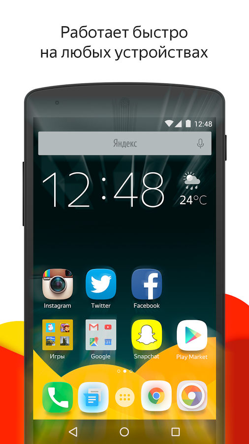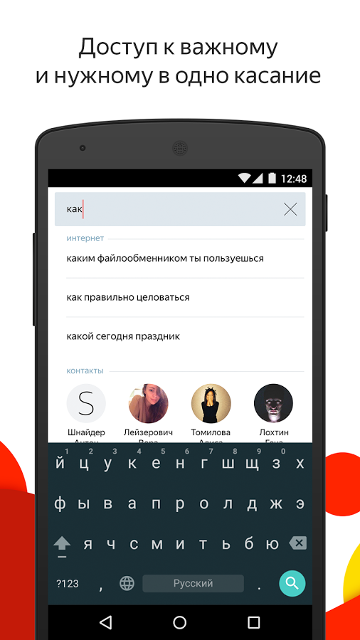 Yandex Launcher собирает на одном экране всё самое важное — сайты и приложения, которые пользователь открывает каждый день, и контакты людей, которым он часто звонит. Открыть экран можно одним движением пальца. Строка поиска позволит найти что угодно и где угодно: файл или контакт — на телефоне, приложение — в Google Play, ответ на любой запрос — в интернете.