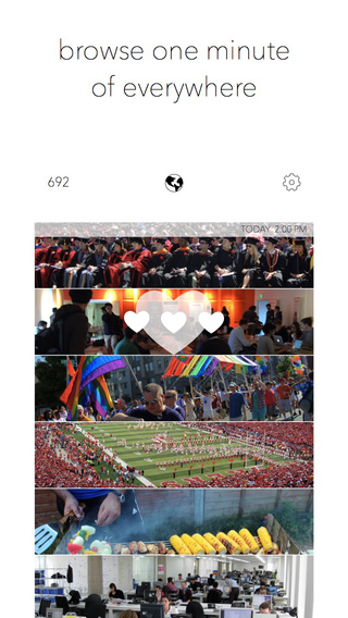 Приложение невероятно простое: никаких фильтров, никаких шерингов в других аппах, никакого личного фида, никакого профайла, только локация. Когда ты получаешь уведомление от Oneminute, достаточно сделать всего пару касаний, и твое фото станет частью главного поля. В отличие от того же Instagram, у этого приложения единственная цель — запечатлеть текущий момент.