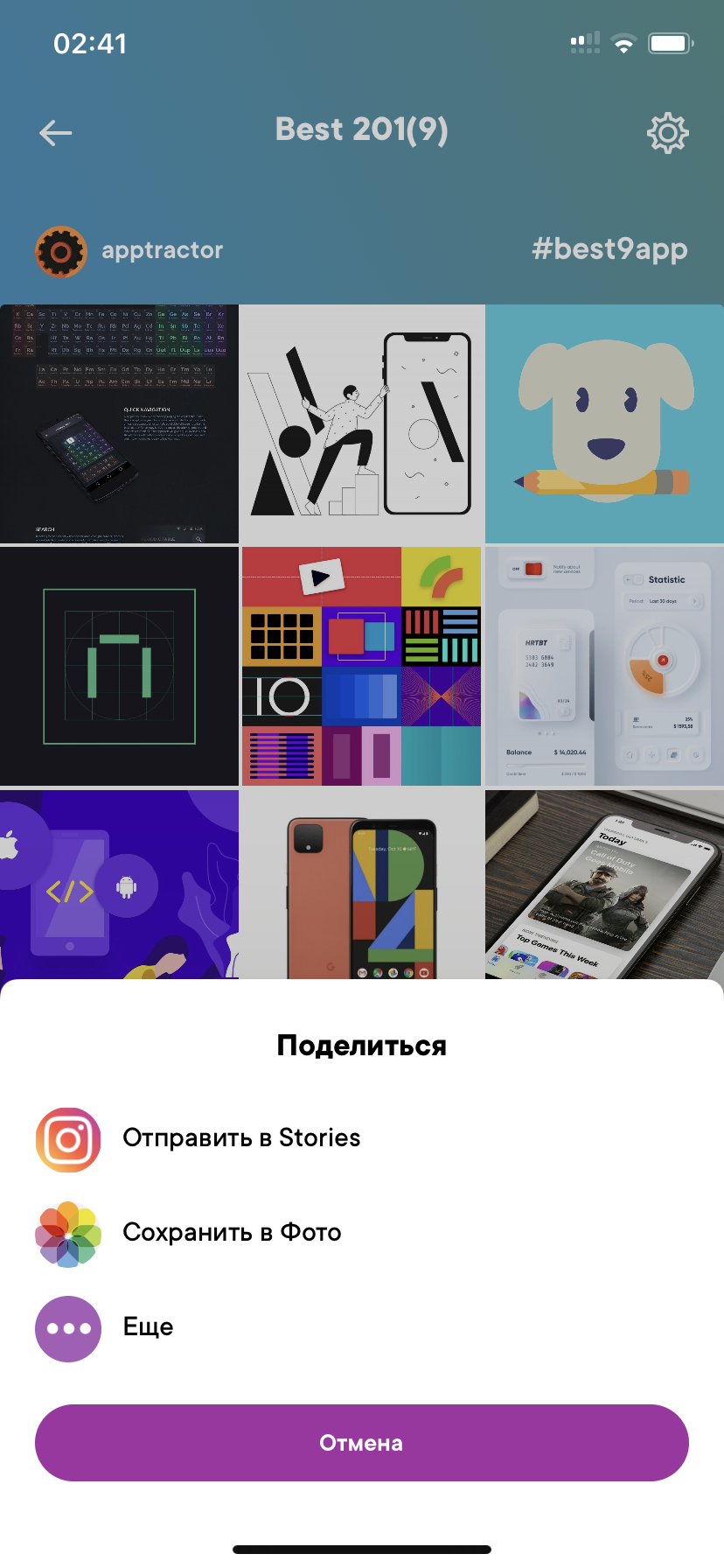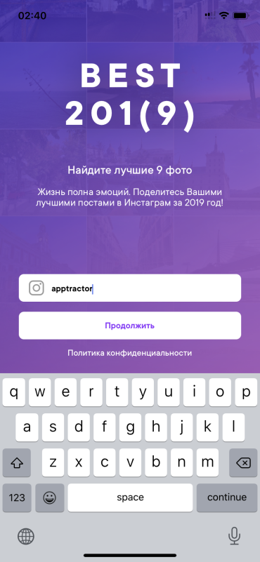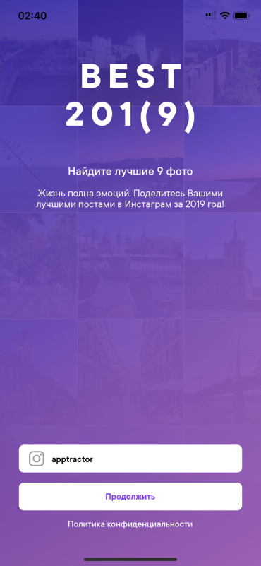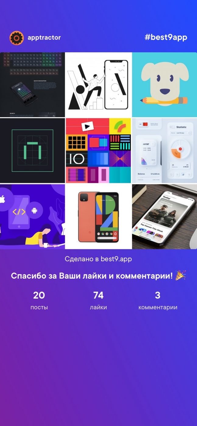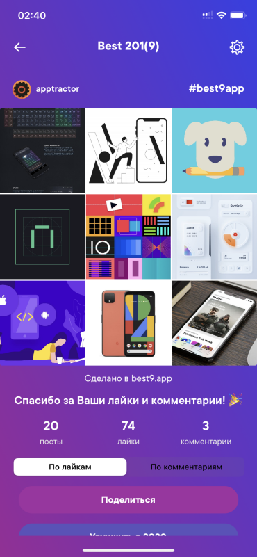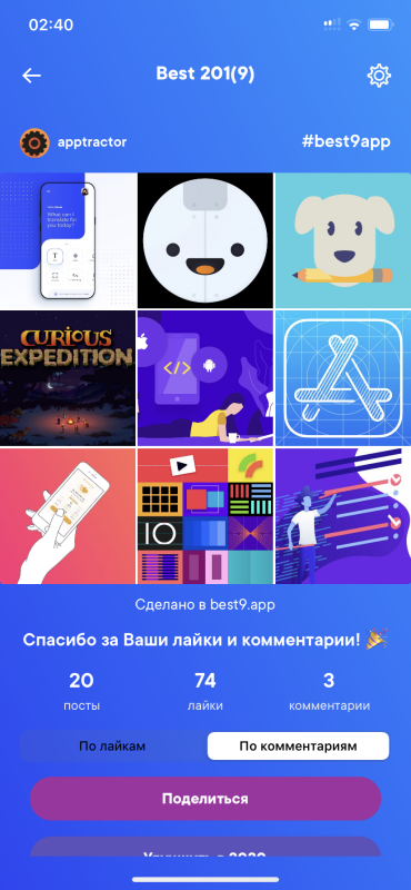 Разрабатывая best9.app, мы максимально слаженно выполняли свои роли в команде, и, как бы это невероятно не звучало, iOS-приложение было готово уже через сутки. Оно работало так, как мы и задумали: посередине красовался коллаж из девяти фото, а под ним счетчик, сколько всего лайков и комментариев смог набрать пользователь Instagram за уходящий год. Для особо скептически настроенных пользователей мы сделали группировку коллажа не только по лайкам, но и по комментариям на выбор. Фон переливался градиентом из различных цветов, делая публикацию в Stories уникальной. Так мы решили проблему абсолютно одинаковых сторис, надоедающих аудитории.