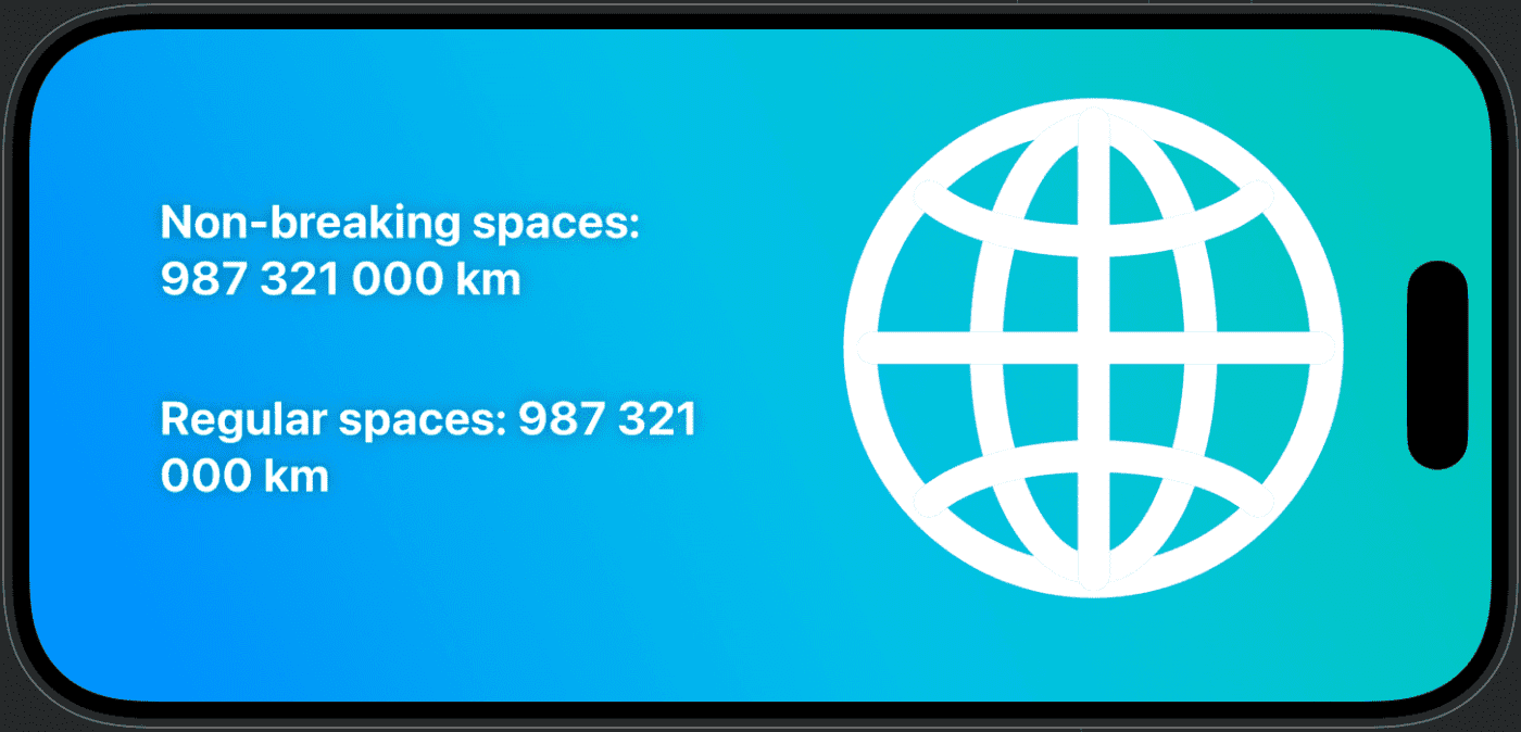 Text("Total distance covered: \(veryLargeNumber.formattedGrouped.nonBreakingSpaces) km")