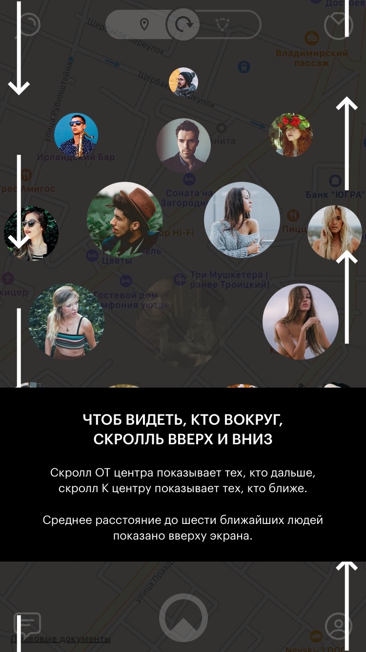 Тут всё неплохо обыграно с анимацией и текстами. Есть обучалка, которая проводит по каждому пункту, её вроде даже читаешь, потом в пятый раз нажимаешь «ОК» и всё – оказываешься на главном экране, где вокруг куча людей в кругах, и ты ничего не понимаешь.