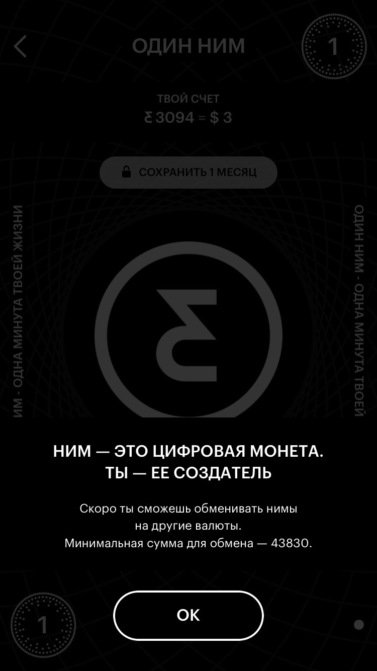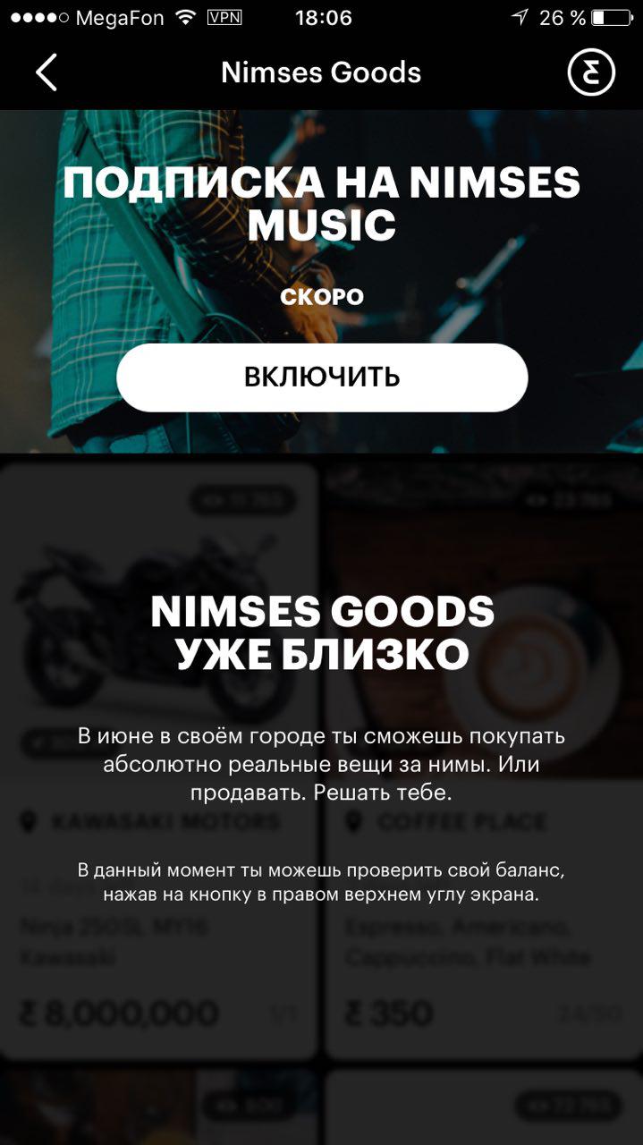 На главном экране тапаю по непонятной иконке в правом углу и попадаю в «Nimses Goods». Здесь анонс магазина, в котором скоро можно будет покупать реальные вещи за нимы и, конечно же, музыку. Мне нравится, что на бэкграунде есть заблюренные карточки товаров с приблизительными ценниками. Можно примерно прикинуть порядок цен с этой магической валютой. Никто не говорит, что так и будет, но почему-то хочется верить. К сожалению, сейчас ничего купить нельзя. Это всё интрига или пузырь. Плюс в этом разделе написана философия нима, объясняющая его как единицу времени (минуту).