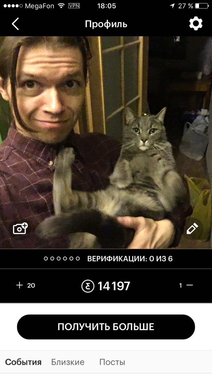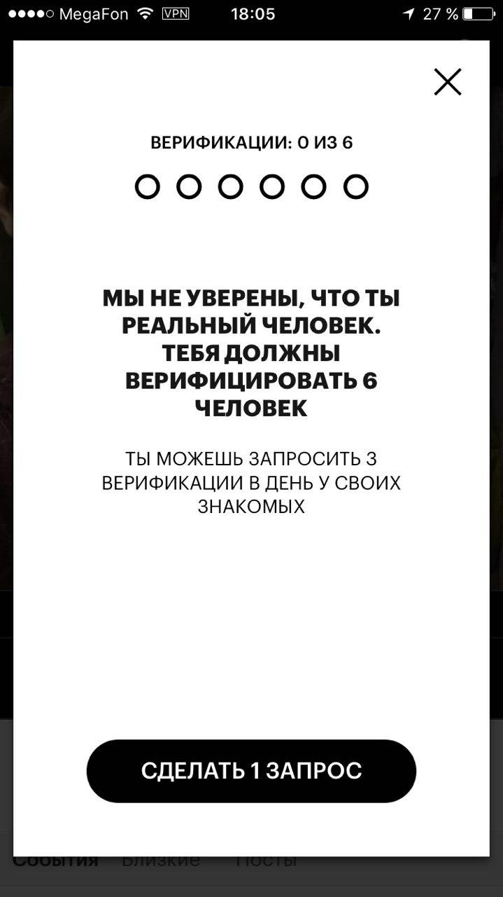 Недавно в профиле появилась верификация. Очевидно, разработчики всё же решили взять приложение под контроль и очистить его от ботов, женщин лёгкого поведения и прочей нечисти. Для этого нужно запросить верификацию у 6 человек (не более 3 в день). У тех, кто может подтвердить, должен стоять статус «Human», но среди них я не вижу ни одного знакомого, зато уже вижу людей, которые выкладывают посты «Верифицирую за 3000 нимов».