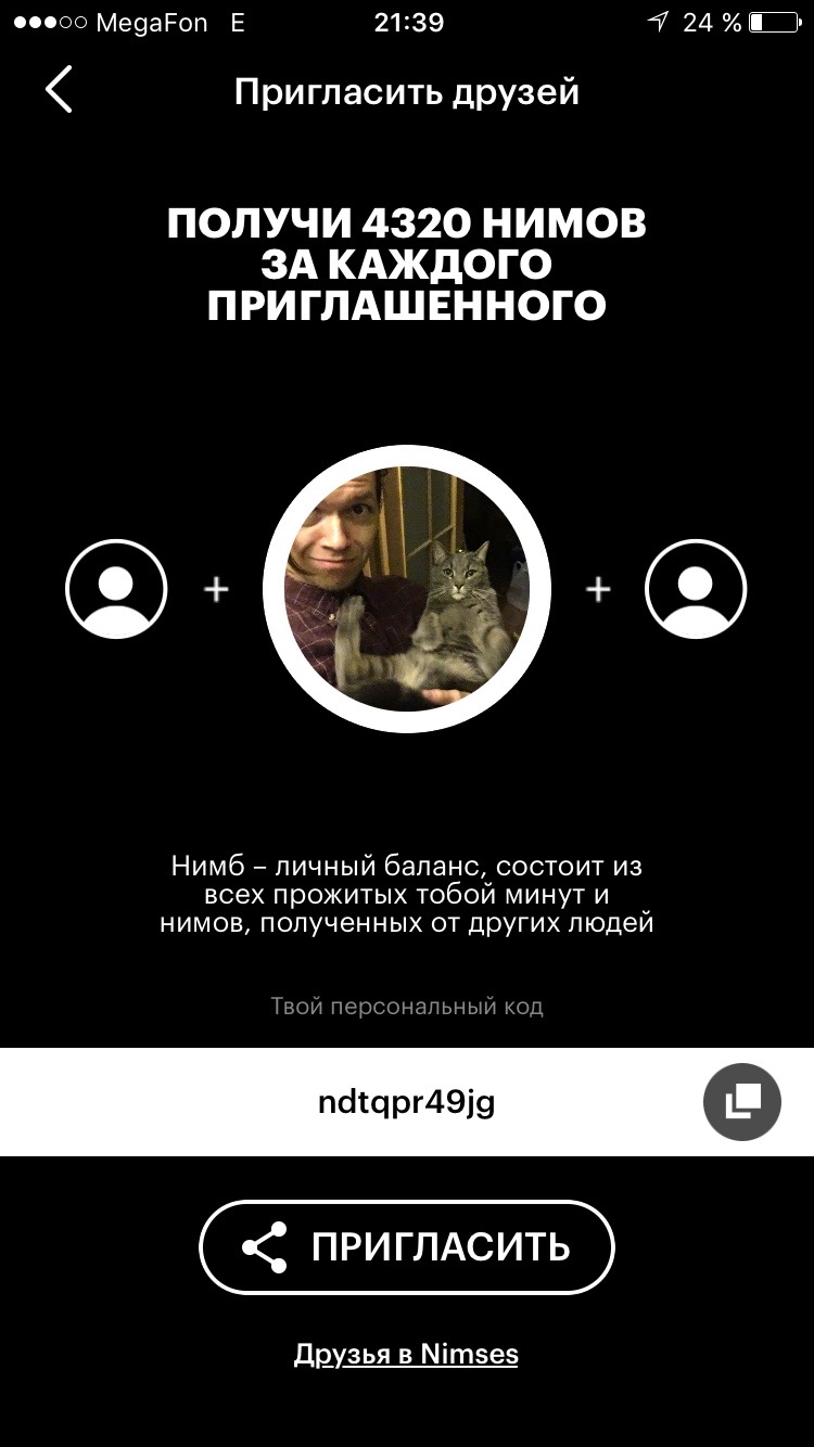 На следующем экране под большой кнопкой «Пригласить» я увидел маленькую ссылочку «Друзья в приложении» и стало не так тревожно: я нашёл нескольких друзей. Теперь я не одинок. Но почему они так спрятали эту функцию, для меня загадка. На фоне остальных разделов, эта маленькая ссылочка выглядит незаметной. Обычно это первое, что предлагают социальные сети: «Смотри, здесь твои друзья, значит и ты должен быть здесь». Разумеется, Nimses предлагает только друзей из списка контактов, ведь здесь нельзя зарегистрироваться через соцсети.