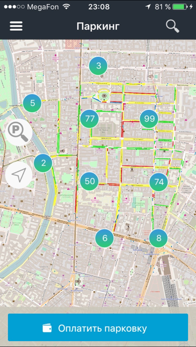 Есть интересная фишка: показать ближайшую свободную парковку. Приложение просто кидает на другую часть карты. Хотя можно было предложить построить маршрут до неё, чтобы как можно скорее припарковаться.