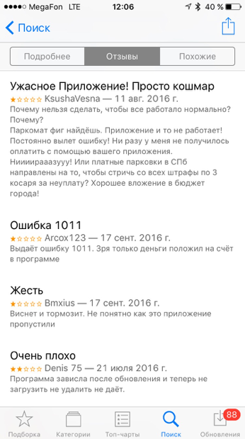 Реакция у пользователей однозначная. Её видно на скриншоте. Мне, в отличии от многих, всё же удалось несколько раз оплатить парковку через приложение, но назвать интерфейс «интуитивно понятным», «дружелюбным» или хотя бы нормально работающим я не могу.
