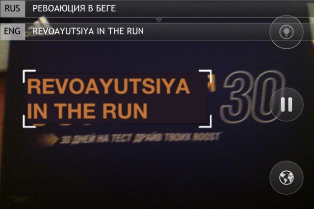 Приложение переводит крупные вывески и заголовки в режиме реального времени сразу же на телефоне. Создано российским разработчиком (что приятно). При загрузке доступны лишь базовые 2 языка: русский и английский. Остальные 8, среди которых немецкий и французский, можно скачать отдельно за 66 рублей каждый. Используются сторонние онлайн-переводчики от компании Яндекс, Bing и Google. Поэтому обойтись без онлайн соединения не получится. Пока приложение работает нестабильно и иногда выводит ошибку, для исправления которой нужно навести камеру на другой объект и снова вернуть. Требуется ширина текста от 5 до 30 мм и лишь базовые шрифты. С 3 попытки у меня получилось отсканировать флаер и выполнить неплохой перевод с русского на английский базовых слов. После неподвижного удержания камеры около 15 секунд дается вполне достойный перевод слов. Впечатляюще! Вот как это примерно выглядит: