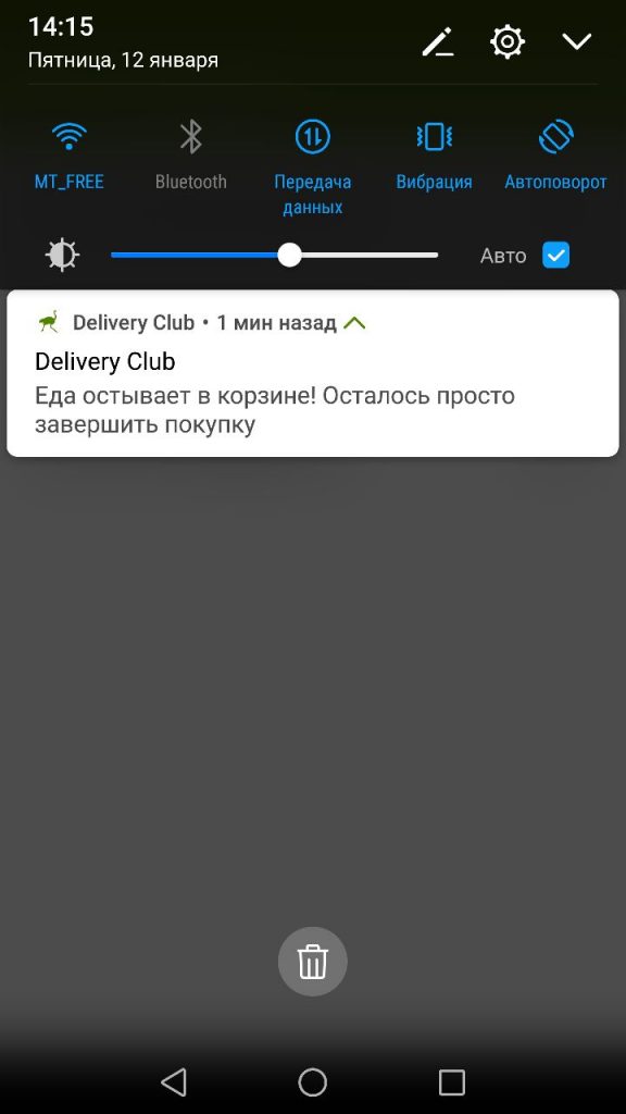 Здесь приведу простой пример неудачной стратегии: в популярном приложении Delivery Club по истечении нескольких минут с момента добавления в корзину товаров пользователю приходит уведомление о том, что “еда в корзине остывает”. Возможно, это уведомление актуально при многих сценариях поведения пользователей, и наверняка разработчики тестировали и выверяли это. Вот только есть одно но: эти уведомления нельзя отключить внутри приложения. Если быть точнее, то они приходят несмотря на то, что все уведомления от этого приложения на устройстве отключены. Не надо так делать.
