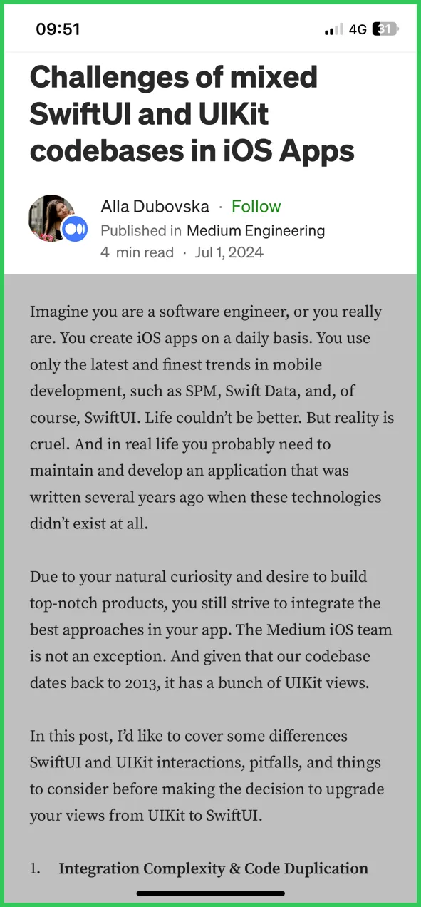 Один из самых устаревших кусков кода, на котором сейчас основано приложение Medium для iOS, — это наш рендерер историй. Он был частично переписан в 2019 году, что привело к своим сложностям, которые я не буду описывать здесь, но в нем сохранился тот же движок рендеринга UIKit и общий дизайн, поскольку он связан с тем, как мы моделируем контент и метаданные историй.