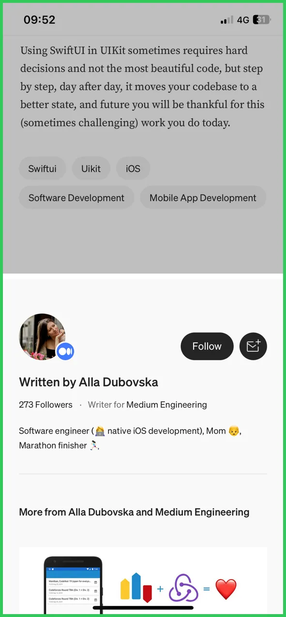Совсем недавний пример использования возможностей “проращивания” — когда нам понадобилось внедрить несколько новых разделов рекомендаций в нижний колонтитул страницы истории, чтобы показать пользователям больше историй из списка, к которому принадлежала текущая история. Учитывая имеющуюся у нас возможность создавать пользовательские интерфейсы вне рендерера страницы истории и затем встраивать их, мы смогли создать весь этот раздел рекомендаций в SwiftUI (и в собственном модуле SPM), а затем встроить его в рендерер UIKit в качестве нового элемента нижнего колонтитула.