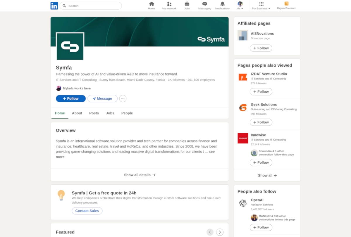 Компания: У Symfa была полноценная страница компании в LinkedIn. Профессиональный брендинг. Много сотрудников. Публикации о «трансформации недвижимости с помощью блокчейна». У них даже были партнёрские страницы и сети подписчиков.