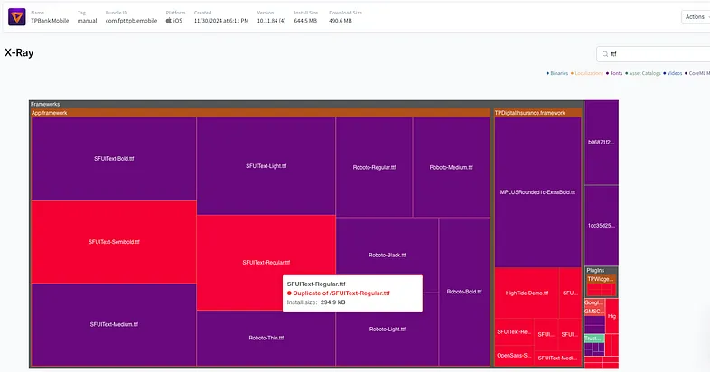 Двоичные файлы Swift содержат большое количество символов, которые используются динамическим компоновщиком. В производственных сборках они, как правило, не нужны. Приложение TPBank не удаляет эти ненужные символы, что увеличивает размер приложения.