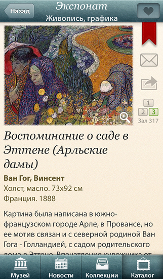 Изысканное приложение от Государственного музея Эрмитаж помимо уточненного дизайна приятно удивляет функционалом. Из него можно узнать краткую историю музея, как его найти, последние новости и расписание выставок. На них тут же можно заказать билеты. В приложении есть схематическая карта здания, к сожалению, без фотографий. Можно купить или скачать бесплатно дополнения: панорамы залов, трехмерные модели, иллюстрации по различным темам. Очень удобная функция поиска по каталогу позволяет узнать, в каком зале музея искать заинтересовавшую картину, механизм, костюм. Фотографией любого понравившегося экспоната можно поделиться с друзьями, сохранить ее на устройство или добавить в личную коллекцию. Как утверждают разработчики, приложение ориентировано на будущих посетителей Эрмитажа. Однако отмечено, что оно будет интересно и для тех, кто «предпочитает знакомиться с музеем, не выходя из дома, и узнать больше об искусстве». И описание не обманывает: познавательная функция приложения на достойном уровне.