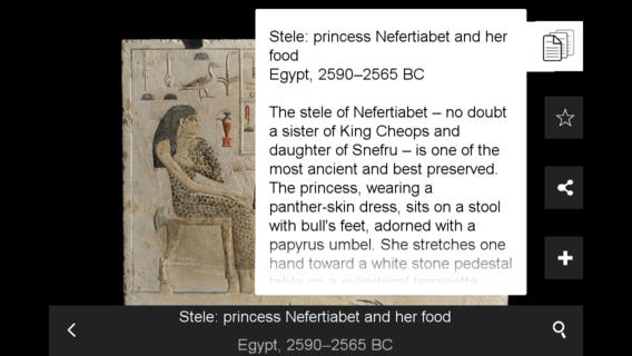 The Met — официальное приложение одного из крупнейших и третьего по посещаемости музея мира Метрополитен, расположенного в Нью-Йорке. The Met порадует любителей искусства своим лаконичным и приятным дизайном и удобным, динамичным и интуитивно понятным интерфейсом. С помощью приложения можно узнать о предстоящих событиях и выставках, купить на них билеты, просмотреть некоторые экспонаты музея. The Met может выполнять образовательную функцию: фотографии бюстов и ваз снабжены кратким описанием. Как и другие мобильные приложения зарубежных музеев, The Met не русифицировано, поэтому вам потребуется знание английского. Использовать его для обогащения багажа знаний — не самая лучшая идея. Вы, скорее, захотите побывать в музее, чем будете исследовать тему искусства.