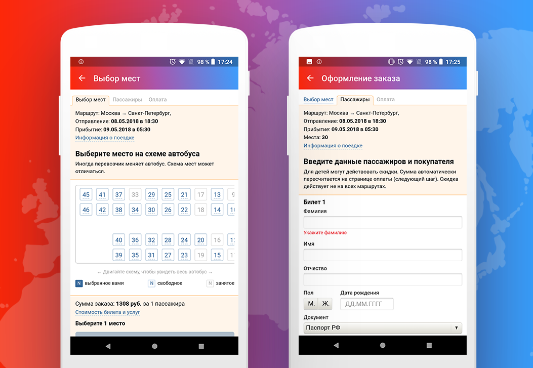 Рейс выбран, пора переходить к покупке. Во многом это самая важная часть любого приложения для покупки билетов, для ускорения работ нам пришлось реализовать ее в виде веб-страниц, встроенных в приложение.