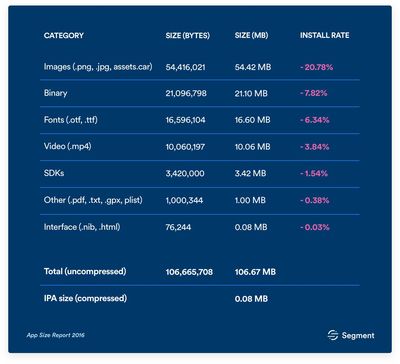 Я слышал от клиентов и других мобильных разработчиков, что установки значительно падают, когда размер приложения достигает 100 Мб. На самом деле, главный менеджер в одной большой мобильной компании рассказал мне недавно, что он отведет следующие полгода на уменьшение размера своих приложений для того, чтобы они оставались меньше 100 Мб в то время, как они продолжат разрабатывать новые функции.