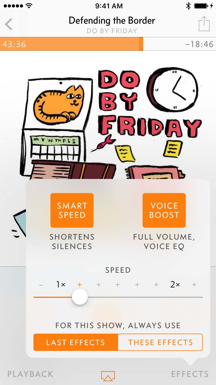 Я думаю, что это будет наиболее спорное изменение в Overcast 3, так как оно замедлит воспроизведение, но я обнаружил, что работает оно заметно лучше и более последовательно — большинство людей привыкает к новому управлению за пару дней, а приложение становится более простым в использовании для всех.