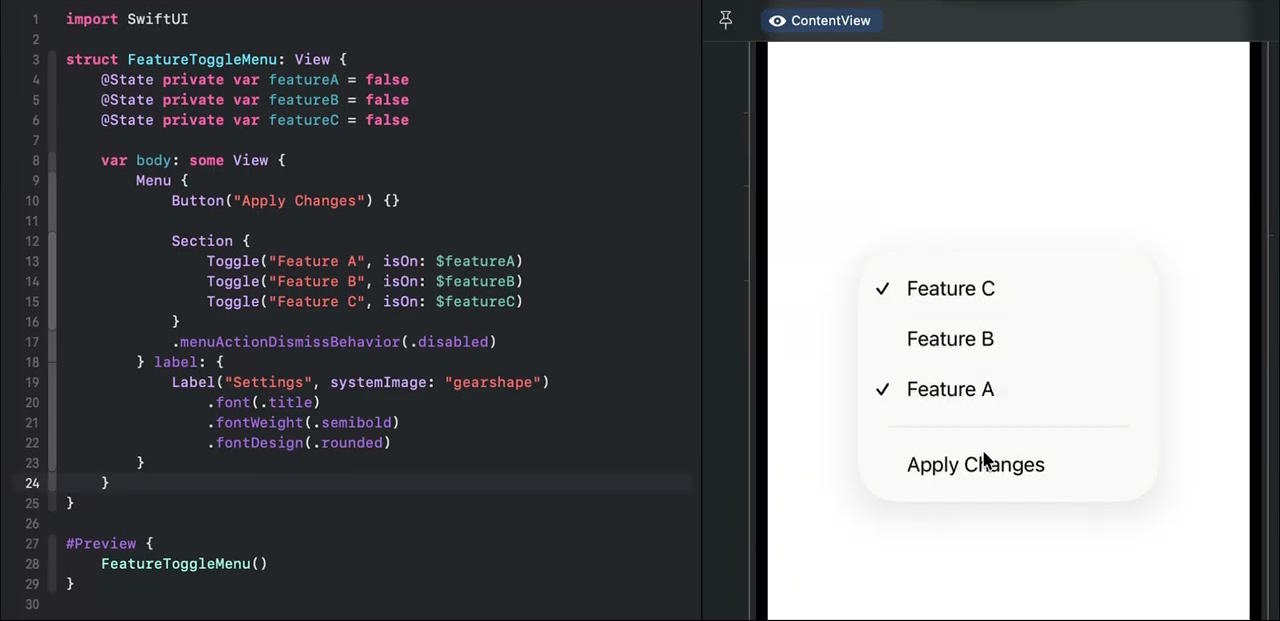 Модификатор menuActionDismissBehavior(_:) — это удобный API для преобразования типичных меню SwiftUI в более надежные мини-интерфейсы для настроек, переключателей и многошаговых рабочих процессов. Продуманное использование этого может привести к более понятному и интуитивно понятному пользовательскому интерфейсу, когда вам нужно больше, чем простое взаимодействие «выбрать и применить».