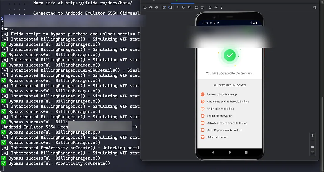 Объединение этих приемов в одном скрипте Frida позволяет нам обойти все механизмы биллинга: