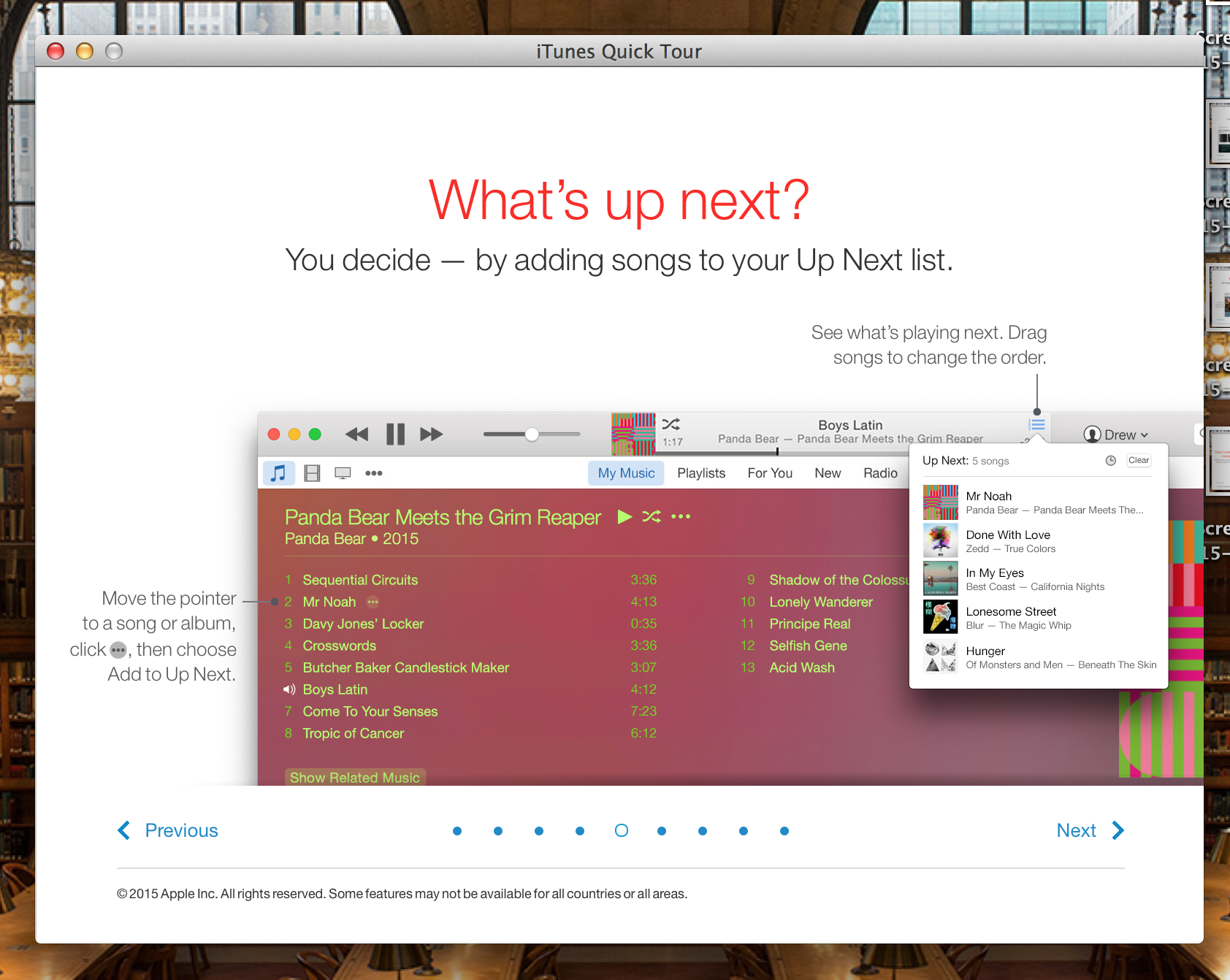 “Быстрый” тур iTunes учит пользователя проигрывать музыку, создавать плейлисты, добавлять песни в очередь, пользоваться магазином и т.д. Пользователь не сможет воспринять столько информации, и это напрасная трата времени. Они хотят попасть в iTunes, чтобы послушать новый альбом J Cole, а не читать инструкцию.