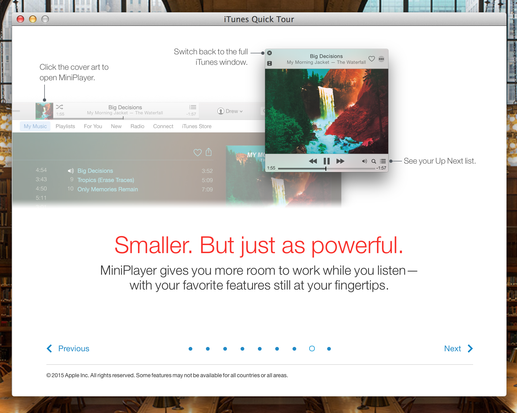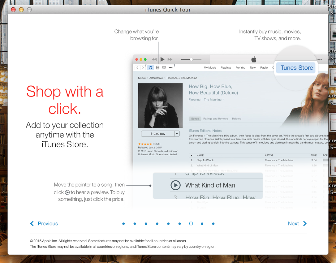 “Быстрый” тур iTunes учит пользователя проигрывать музыку, создавать плейлисты, добавлять песни в очередь, пользоваться магазином и т.д. Пользователь не сможет воспринять столько информации, и это напрасная трата времени. Они хотят попасть в iTunes, чтобы послушать новый альбом J Cole, а не читать инструкцию.