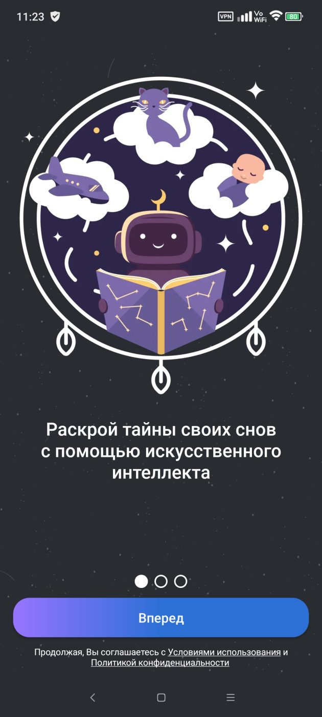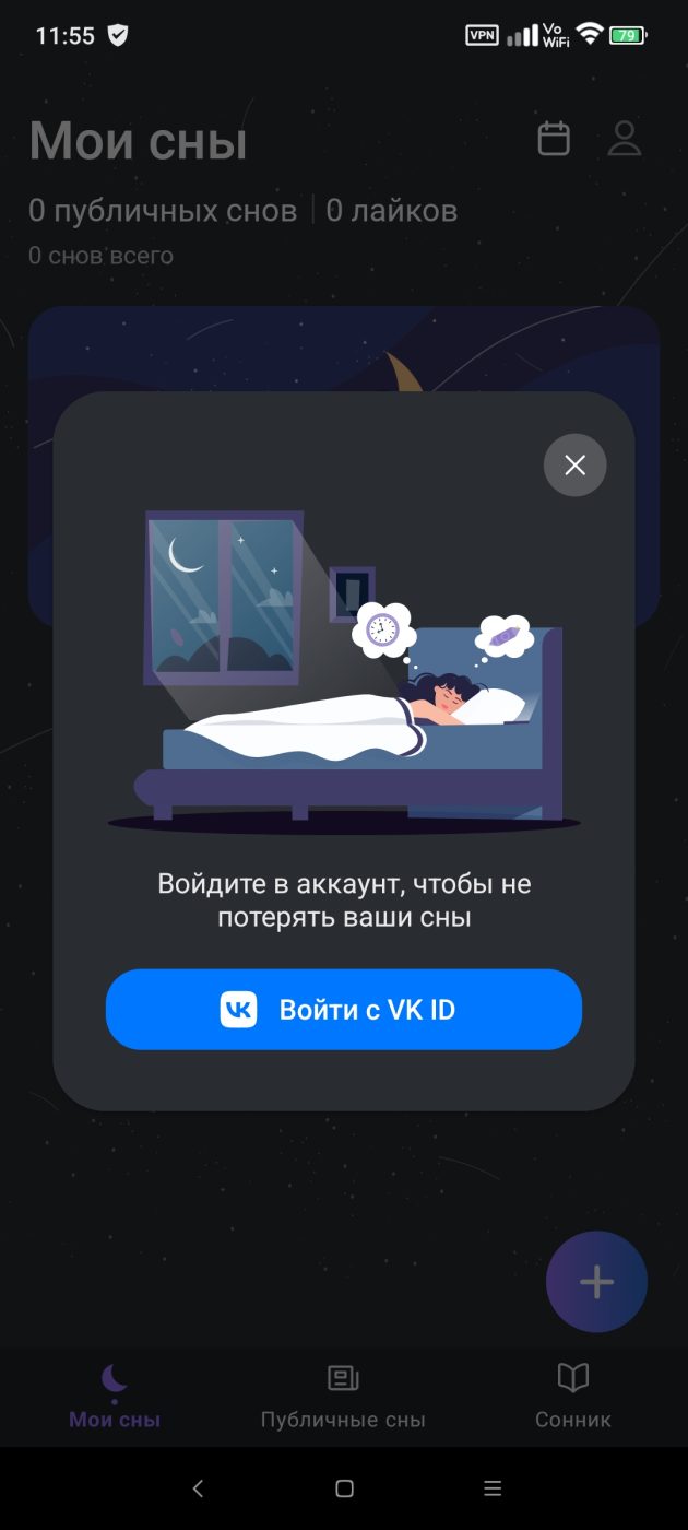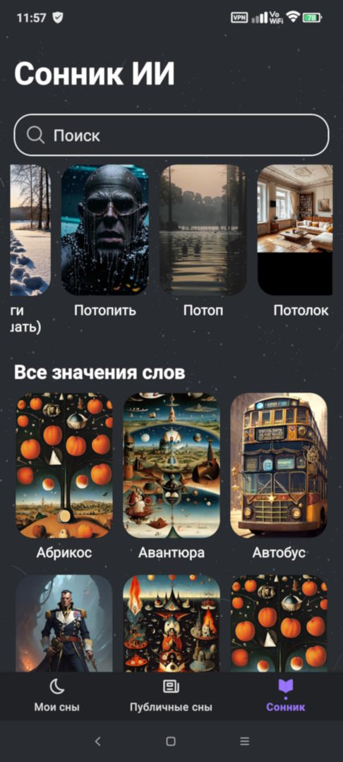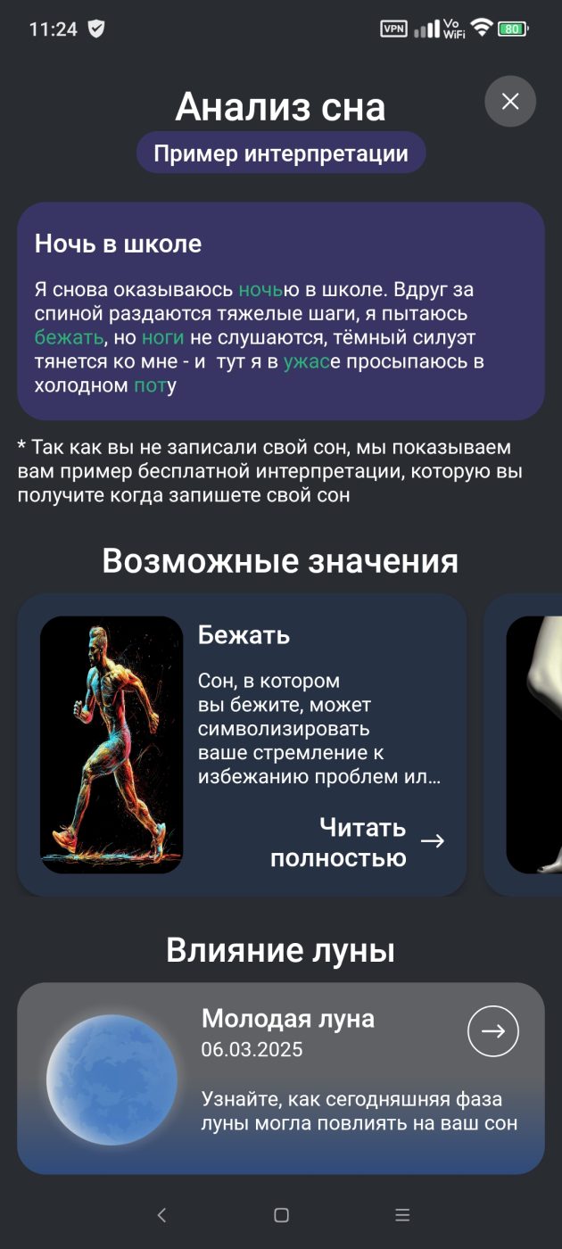 Приложение «толкует» сны с помощью ИИ. Есть ведение заметок о сне, лунный календарь, сонник с самыми популярными темами, генерация картинок для сна, дневник сна. Интересная фишка — «Публичные сны», лента со снами, которые опубликовали пользователи (см. дальше).