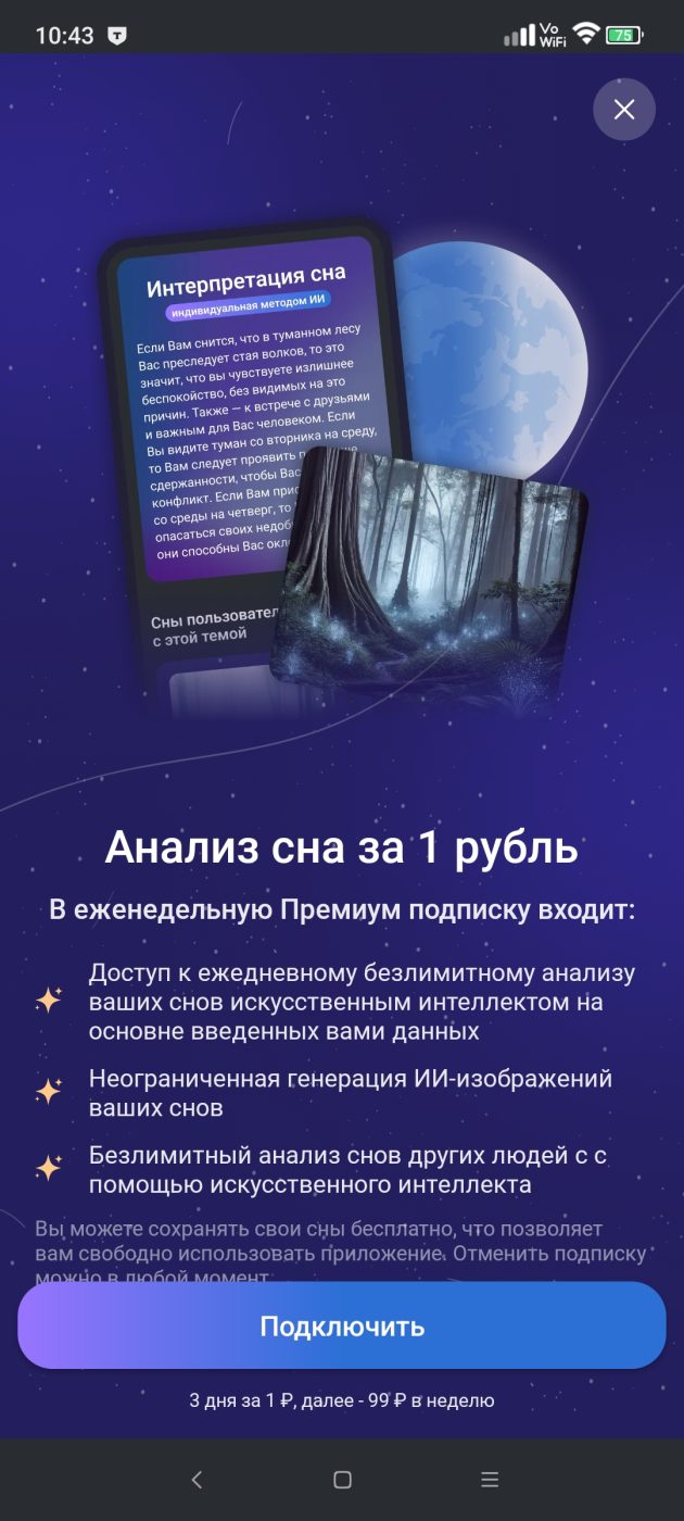 - 99 рублей в неделю подписки — сильный ход, но, кажется, не очень честный. Понятно, что затраты на ИИ могут быть значительными, но 500 рублей в месяц за сонник это перебор.