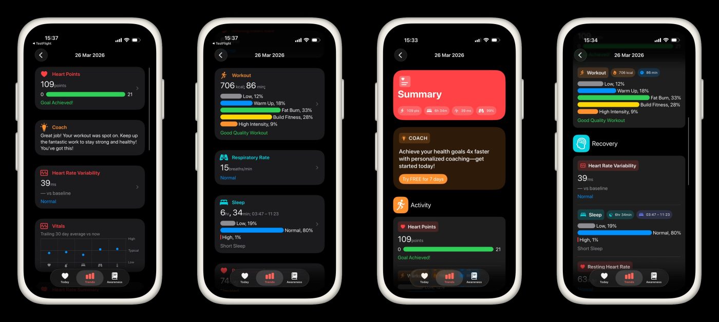 Выше показаны четыре скриншота. Первые два отражают текущее состояние моего приложения CardioBot. Следующие два — это результат, к которому я хочу прийти. Как можно заметить, сейчас я использую стандартный List, и мне по-прежнему нравится, как приложение выглядит и ощущается в работе. Но я решил пересмотреть свой UI. Хочется сохранить простоту и привычность для пользователей iPhone, но при этом сделать интерфейс чуть более выразительным.
